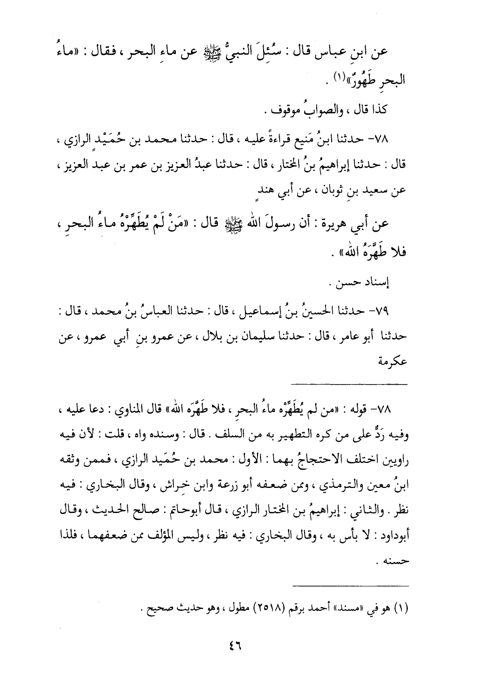 78 - حَدَّثَنَا ابْنُ مَنِيعٍ قِرَاءَةً عَلَيْهِ , نا مُحَمَّدُ بْنُ حُمَيْدٍ الرَّازِيُّ , نا إِبْرَاهِيمُ بْنُ الْمُخْتَارِ , نا عَبْدُ الْعَزِيزِ بْنُ عُمَرَ بْنِ عَبْدِ الْعَزِيزِ , عَنْ سَعِيدِ بْنِ ثَوْبَانَ , عَنْ أَبِي هِنْدَ , عَنْ أَبِي هُرَيْرَةَ رَضِيَ اللَّهُ عَنْهُ , أَنَّ رَسُولَ اللَّهِ صَلَّى اللهُ عَلَيْهِ وَسَلَّمَ قَالَ: § «مَنْ لَمْ يُطَهِّرْهُ مَاءُ الْبَحْرِ فَلَا طَهَّرَهُ اللَّهُ» إِسْنَادٌ حَسَنٌ