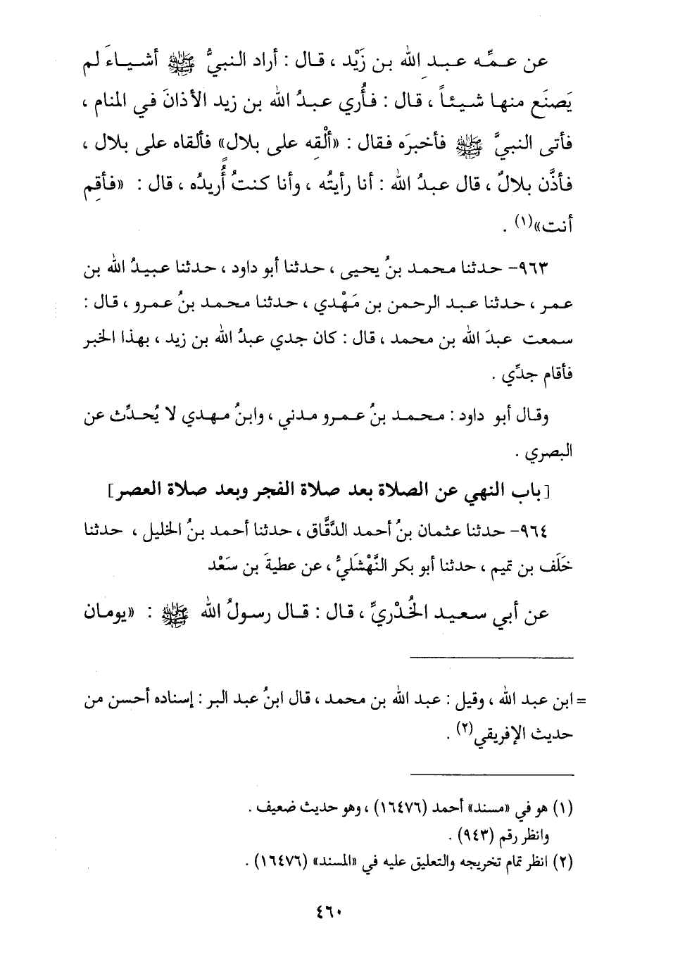 964 - حَدَّثَنَا عُثْمَانُ بْنُ أَحْمَدَ الدَّقَّاقُ , ثنا أَحْمَدُ بْنُ الْخَلِيلِ , ثنا خَلَفُ بْنُ تَمِيمٍ , ثنا أَبُو بَكْرٍ النَّهْشَلِيُّ , عَنْ عَطِيَّةَ بْنِ سَعْدٍ , عَنْ أَبِي سَعِيدٍ الْخُدْرِيِّ , قَالَ: قَالَ رَسُولُ اللَّهِ صَلَّى اللهُ عَلَيْهِ وَسَلَّمَ: § «يَوْمَانِ -[461]- مِنَ الدَّهْرِ لَا تَصُومُوهُمَا , وَسَاعَتَانِ مِنَ النَّهَارِ لَا تُصَلُّوهُمَا , فَإِنَّ النَّصَارَى وَالْيَهُودَ يَتَحَرُّونَهُمَا , يَوْمَ الْفِطْرِ وَيَوْمَ الْأَضْحَى , وَبَعْدَ صَلَاةِ الْفَجْرِ حَتَّى تَطْلُعَ الشَّمْسُ , وَبَعْدَ صَلَاةِ الْعَصْرِ إِلَى غُرُوبِ الشَّمْسِ»