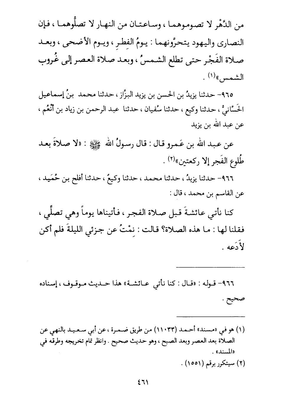 965 - حَدَّثَنَا يَزِيدُ بْنُ الْحُسَيْنِ بْنِ يَزِيدَ الْبَزَّارُ , نا مُحَمَّدُ بْنُ إِسْمَاعِيلَ الْحَسَّانِيُّ , نا وَكِيعٌ , نا سُفْيَانُ , عَنْ عَبْدِ الرَّحْمَنِ بْنِ زِيَادِ بْنِ أَنْعَمَ , عَنْ عَبْدِ اللَّهِ بْنِ يَزِيدَ , عَنْ عَبْدِ اللَّهِ بْنِ عَمْرٍو , قَالَ: قَالَ رَسُولُ اللَّهِ صَلَّى اللهُ عَلَيْهِ وَسَلَّمَ: § «لَا صَلَاةَ بَعْدَ طُلُوعِ الْفَجْرِ إِلَّا رَكْعَتَيْنِ»