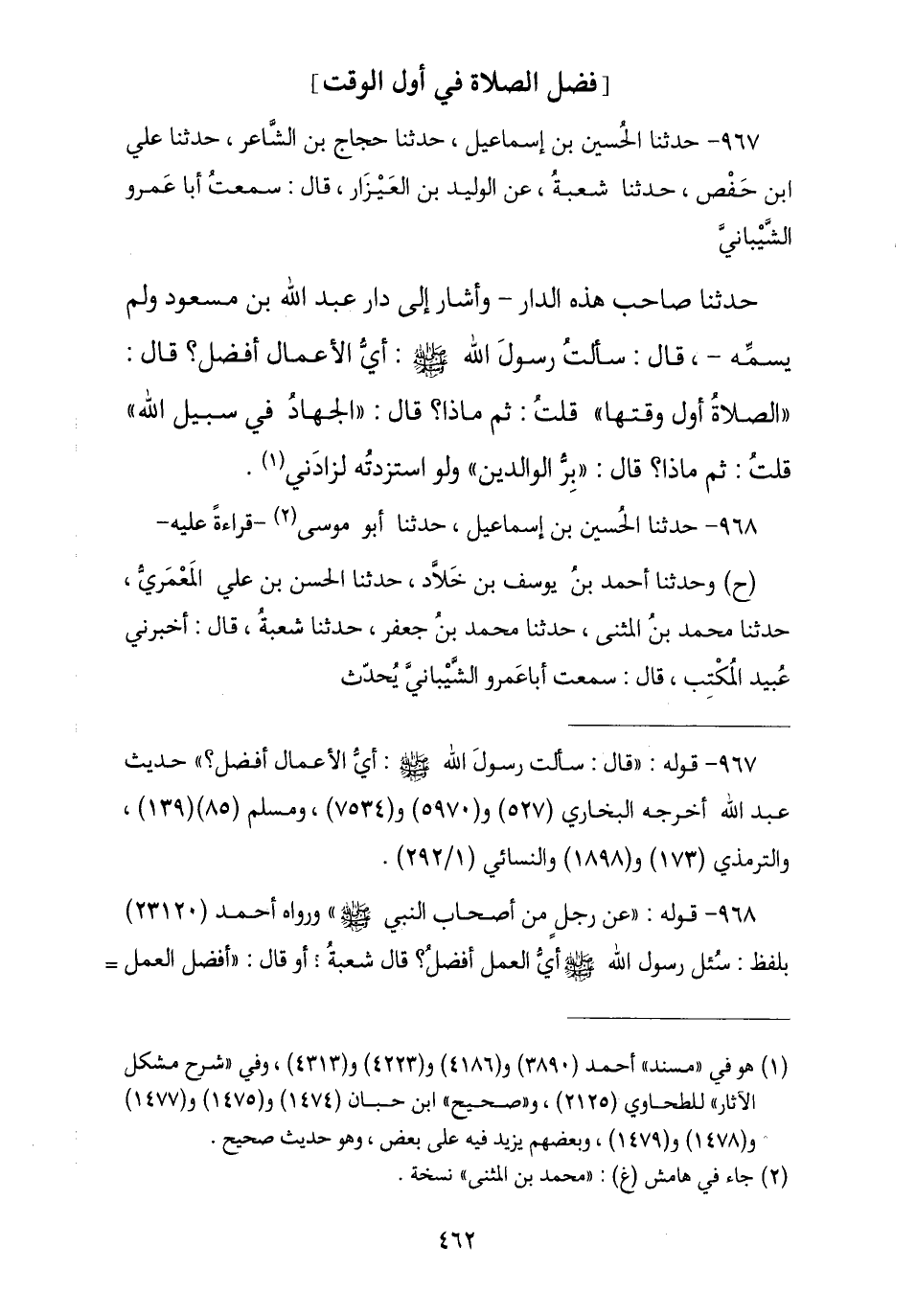 968 - حَدَّثَنَا الْحُسَيْنُ بْنُ إِسْمَاعِيلَ , ثنا أَبُو مُوسَى قِرَاءَةً عَلَيْهِ , وَحَدَّثَنَا أَحْمَدُ بْنُ يُوسُفَ بْنِ خَلَّادٍ , ثنا الْحَسَنُ بْنُ عَلِيٍّ الْمَعْمَرِيُّ , ثنا مُحَمَّدُ بْنُ الْمُثَنَّى , ثنا مُحَمَّدُ بْنُ جَعْفَرٍ , ثنا شُعْبَةُ , أَخْبَرَنِي عُبَيْدٌ الْمُكْتِبُ , قَالَ: سَمِعْتُ أَبَا عَمْرٍو الشَّيْبَانِيَّ , يُحَدِّثُ -[463]- عَنْ رَجُلٍ مِنْ أَصْحَابِ النَّبِيِّ صَلَّى اللهُ عَلَيْهِ وَسَلَّمَ , قَالَ: سُئِلَ رَسُولُ اللَّهِ صَلَّى اللهُ عَلَيْهِ وَسَلَّمَ: §أَيُّ الْعَمَلِ أَفْضَلُ؟ - قَالَ شُعْبَةُ: - أَوْ قَالَ: «أَفْضَلُ الْعَمَلِ الصَّلَاةُ عَلَى وَقْتِهَا». وَقَالَ الْمَعْمَرِيُّ فِي حَدِيثِهِ: «الصَّلَاةُ فِي أَوَّلِ وَقْتِهَا»