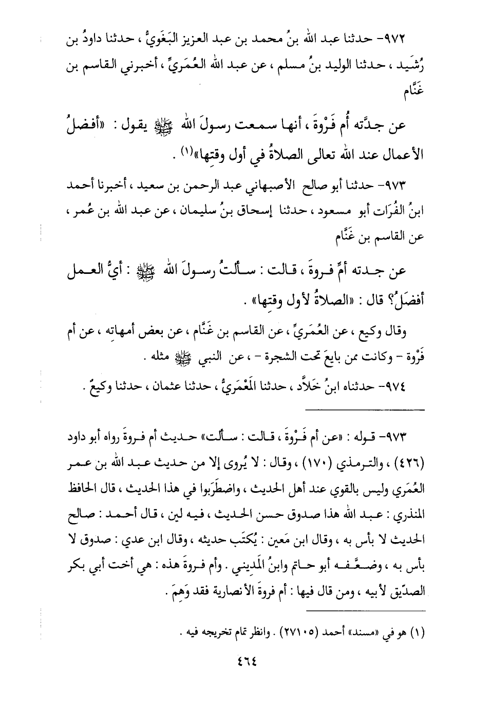 972 - حَدَّثَنَا عَبْدُ اللَّهِ بْنُ مُحَمَّدِ بْنِ عَبْدِ الْعَزِيزِ , ثنا دَاوُدُ بْنُ رُشَيْدٍ , ثنا الْوَلِيدُ بْنُ مُسْلِمٍ , عَنْ عَبْدِ اللَّهِ الْعُمَرِيِّ , أَخْبَرَنِي الْقَاسِمُ بْنُ غَنَّامٍ , عَنْ جَدَّتِهِ أُمِّ فَرْوَةَ , أَنَّهَا سَمِعَتْ رَسُولَ اللَّهِ صَلَّى اللهُ عَلَيْهِ وَسَلَّمَ يَقُولُ: § «أَفْضَلُ الْأَعْمَالِ عِنْدَ اللَّهِ الصَّلَاةُ فِي أَوَّلِ وَقْتِهَا»
