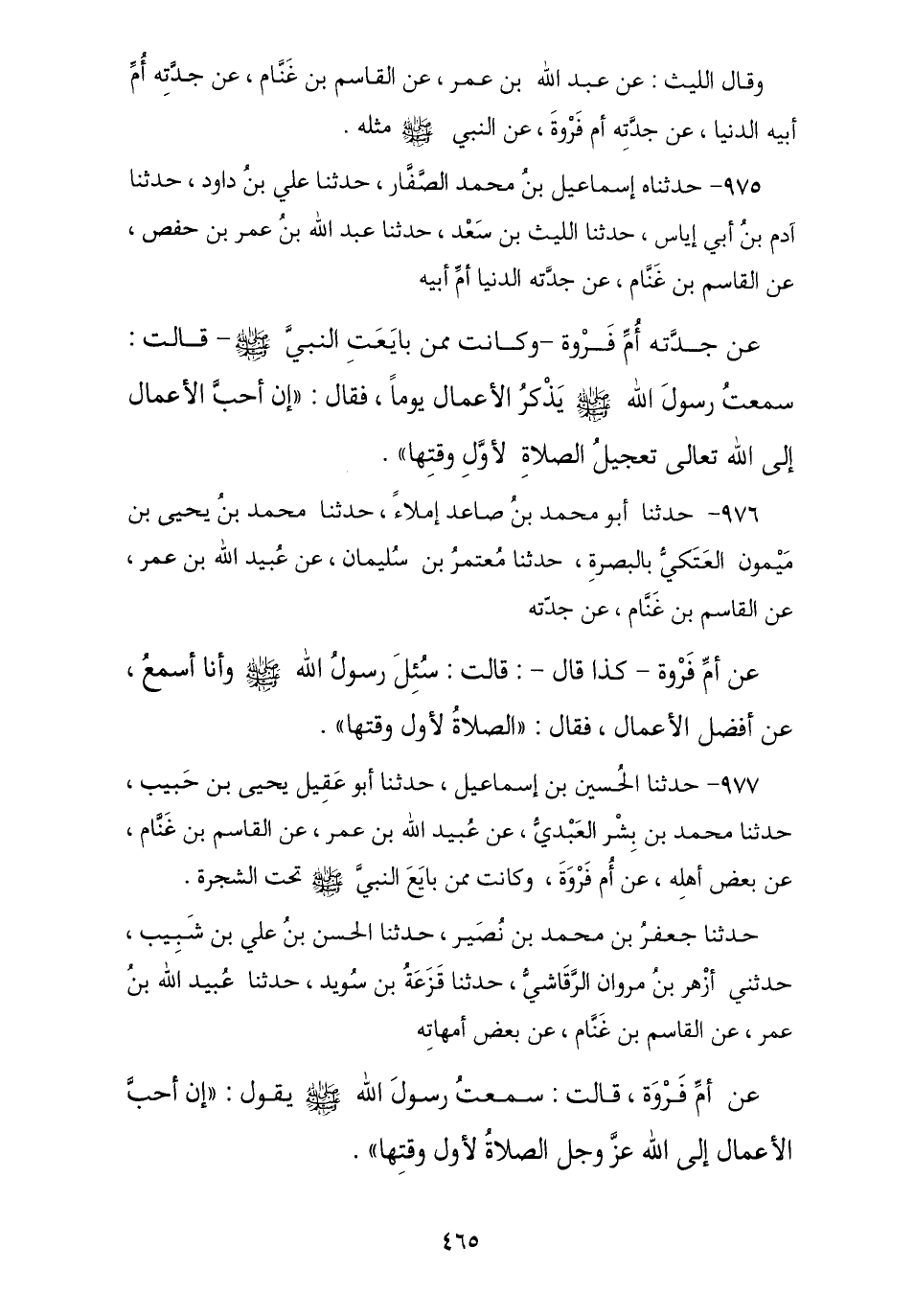 975 - حَدَّثَنَا إِسْمَاعِيلُ بْنُ مُحَمَّدٍ الصَّفَّارُ , ثنا عَلِيُّ بْنُ دَاوُدَ , ثنا آدَمُ بْنُ أَبِي إِيَاسَ , ثنا اللَّيْثُ بْنُ سَعْدٍ , ثنا عَبْدُ اللَّهِ بْنُ عُمَرَ بْنِ حَفْصٍ , عَنِ الْقَاسِمِ بْنِ غَنَّامٍ , عَنْ جَدَّتِهِ الدُّنْيَا أُمِّ أَبِيهِ , عَنْ جَدَّتِهِ أُمِّ فَرْوَةَ , وَكَانَتْ مِمَّنْ بَايَعَتِ النَّبِيَّ صَلَّى اللهُ عَلَيْهِ وَسَلَّمَ , قَالَتْ: سَمِعْتُ رَسُولَ اللَّهِ صَلَّى اللهُ عَلَيْهِ وَسَلَّمَ يَذْكُرُ الْأَعْمَالَ يَوْمًا فَقَالَ: «إِنَّ §أَحَبَّ الْأَعْمَالِ إِلَى اللَّهِ عَزَّ وَجَلَّ تَعْجِيلُ الصَّلَاةِ لَأَوَّلِ وَقْتِهَا»