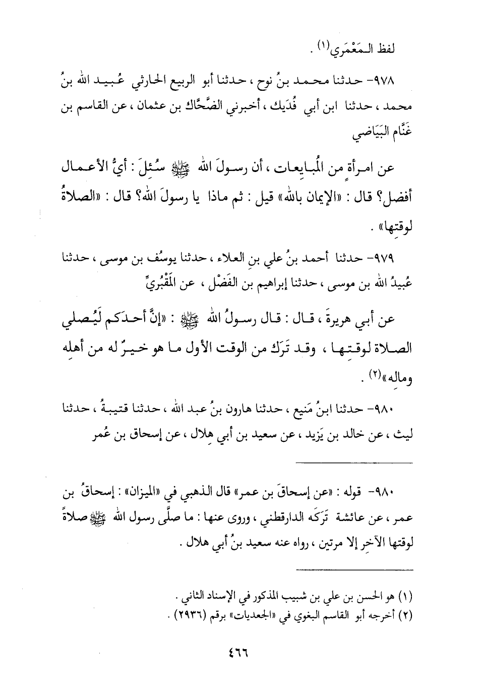 980 - ثنا ابْنُ مَنِيعٍ , ثنا هَارُونُ بْنُ عَبْدِ اللَّهِ , ثنا قُتَيْبَةُ , ثنا لَيْثٌ , عَنْ خَالِدِ بْنِ يَزِيدَ , عَنْ سَعِيدِ بْنِ أَبِي هِلَالٍ , عَنْ إِسْحَاقَ بْنِ عُمَرَ , -[467]- عَنْ عَائِشَةَ , قَالَتْ: § «مَا صَلَّى رَسُولُ اللَّهِ صَلَّى اللهُ عَلَيْهِ وَسَلَّمَ الصَّلَاةَ لِوَقْتِهَا الْآخِرِ إِلَّا مَرَّتَيْنِ حَتَّى قَبَضَهُ اللَّهُ عَزَّ وَجَلَّ»