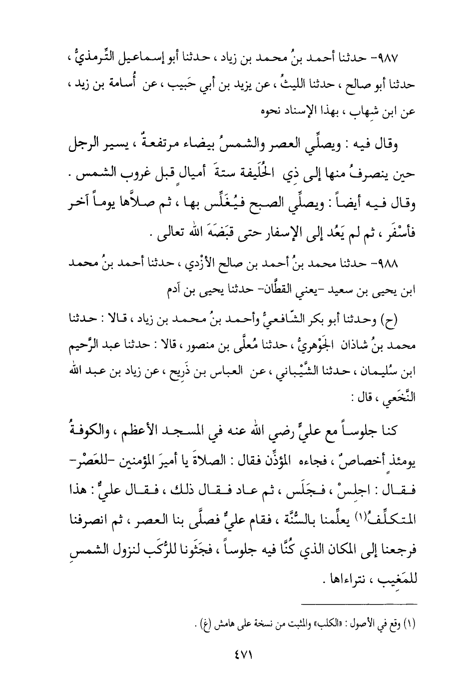 988 - حَدَّثَنَا مُحَمَّدُ بْنُ أَحْمَدَ بْنِ صَالِحٍ الْأَزْدِيُّ , ثنا أَحْمَدُ بْنُ مُحَمَّدِ بْنِ يَحْيَى بْنِ سَعِيدٍ , ثنا يَحْيَى بْنُ آدَمَ , ح وَحَدَّثَنَا أَبُو بَكْرٍ الشَّافِعِيُّ , وَأَحْمَدُ بْنُ مُحَمَّدِ بْنِ زِيَادٍ , قَالَا: حَدَّثَنَا مُحَمَّدُ بْنُ شَاذَانَ الْجَوْهَرِيُّ , ثنا مُعَلَّى بْنُ مَنْصُورٍ , قَالَا: نا عَبْدُ الرَّحِيمِ بْنُ سُلَيْمَانَ , نا الشَّيْبَانِيُّ , عَنِ الْعَبَّاسِ بْنِ ذَرِيحٍ , عَنْ زِيَادِ بْنِ عَبْدِ اللَّهِ النَّخَعِيِّ , قَالَ: كُنَّا جُلُوسًا مَعَ عَلِيٍّ رَضِيَ اللَّهُ عَنْهُ فِي الْمَسْجِدِ الْأَعْظَمِ , وَالْكُوفَةُ يَوْمَئِذٍ أَخْصَاصٌ , فَجَاءَهُ الْمُؤَذِّنُ فَقَالَ: الصَّلَاةُ يَا أَمِيرَ الْمُؤْمِنِينَ لِلْعَصْرِ , فَقَالَ: «اجْلِسْ» , فَجَلَسَ ثُمَّ عَادَ فَقَالَ ذَلِكَ , فَقَالَ عَلِيٌّ رَضِيَ اللَّهُ عَنْهُ: § «هَذَا الْكَلْبُ يُعَلِّمُنَا بِالسُّنَّةِ» , فَقَامَ عَلِيٌّ رَضِيَ اللَّهُ عَنْهُ فَصَلَّى بِنَا الْعَصْرَ , ثُمَّ انْصَرَفْنَا فَرَجَعْنَا إِلَى الْمَكَانِ الَّذِي كُنَّا فِيهِ جُلُوسًا فَجَثَوْنَا لِلرُّكَبِ لِنُزِولِ الشَّمْسِ لِلْمَغِيبِ نَتَرَآهَا. -[472]- زِيَادُ بْنُ عَبْدِ اللَّهِ النَّخَعِيُّ مَجْهُولٌ لَمْ يَرْوِ عَنْهُ غَيْرُ الْعَبَّاسِ بْنِ ذَرِيحٍ