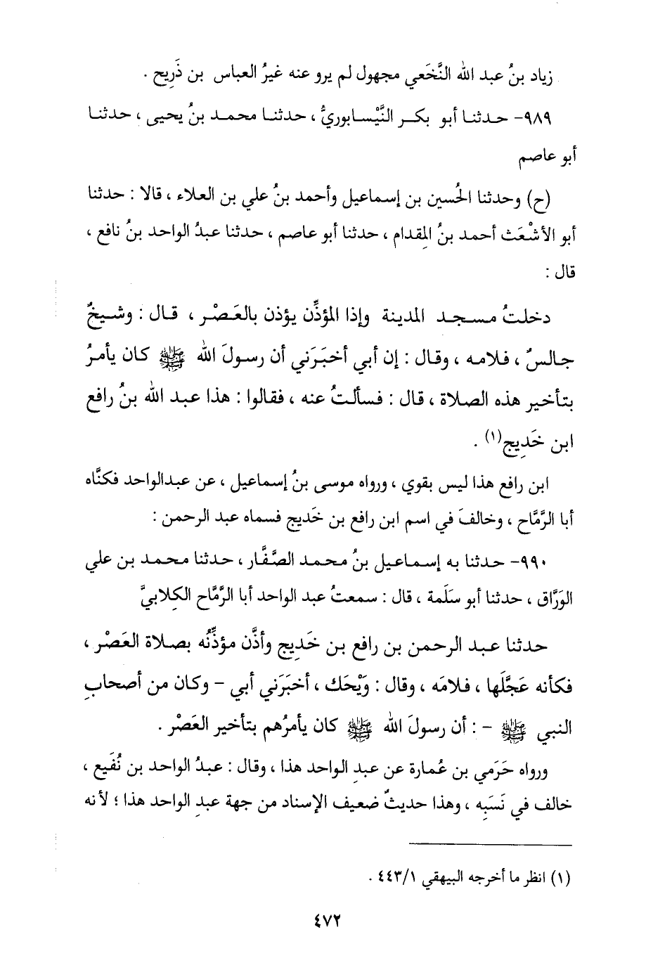 990 - حَدَّثَنَا بِهِ إِسْمَاعِيلُ بْنُ مُحَمَّدٍ الصَّفَّارُ , حَدَّثَنَا مُحَمَّدُ بْنُ عَلِيٍّ الْوَرَّاقُ , ثنا أَبُو سَلَمَةَ , قَالَ: سَمِعْتُ عَبْدَ الْوَاحِدِ أَبَا الرَّمَّاحِ الْكِلَابِيَّ , ثنا عَبْدُ الرَّحْمَنِ بْنُ رَافِعِ بْنِ خَدِيجٍ , وَأَذَّنَ مُؤَذِّنُهُ بِصَلَاةِ الْعَصْرِ فَكَأَنَّهُ عَجَّلَهَا , فَلَامَهُ قَالَ: وَيْحَكَ أَخْبَرَنِي أَبِي , وَكَانَ مِنْ أَصْحَابِ النَّبِيِّ صَلَّى اللهُ عَلَيْهِ وَسَلَّمَ , أَنَّ رَسُولَ اللَّهِ صَلَّى اللهُ عَلَيْهِ وَسَلَّمَ § «كَانَ يَأْمُرُهُمْ بِتَأْخِيرِ الْعَصْرِ». وَرَوَاهُ حِرْمِيُّ بْنُ عُمَارَةَ , عَنْ عَبْدِ الْوَاحِدِ هَذَا , وَقَالَ: عَبْدُ الْوَاحِدِ بْنُ نُفَيْعٍ خَالَفَ فِي نَسَبِهِ , وَهَذَا حَدِيثٌ ضَعِيفُ الْإِسْنَادِ مِنْ جِهَةِ عَبْدِ الْوَاحِدِ هَذَا , لِأَنَّهُ -[473]- لَمْ يَرْوِهِ عَنِ ابْنِ رَافِعِ بْنِ خَدِيجٍ غَيْرُهُ , وَقَدِ اخْتُلِفَ فِي اسْمِ ابْنِ رَافِعٍ هَذَا وَلَا يَصِحُّ هَذَا الْحَدِيثُ عَنْ رَافِعٍ وَلَا عَنْ غَيْرِهِ مِنَ الصَّحَابَةِ , وَالصَّحِيحُ عَنْ رَافِعِ بْنِ خَدِيجٍ وَعَنْ غَيْرِ وَاحِدٍ مِنْ أَصْحَابِ النَّبِيِّ صَلَّى اللهُ عَلَيْهِ وَسَلَّمَ ضِدُّ هَذَا , وَهُوَ التَّعْجِيلُ بِصَلَاةِ الْعَصْرِ وَالتَّبْكِيرِ بِهَا فَأَمَّا الرِّوَايَةُ الصَّحِيحَةُ عَنْ رَافِعِ بْنِ خَدِيجٍ