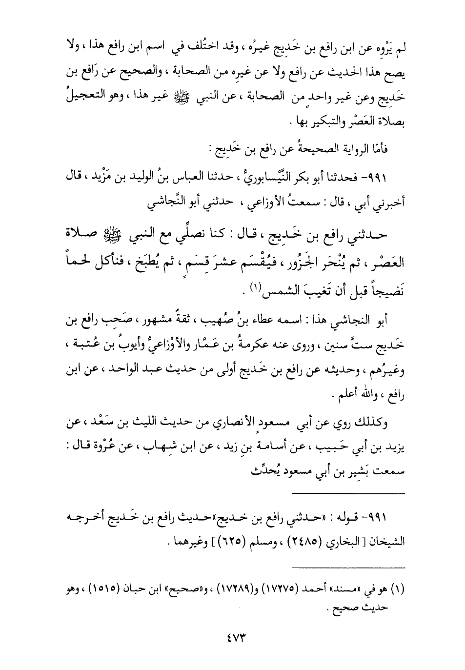 991 - فَحَدَّثَنَا أَبُو بَكْرٍ النَّيْسَابُورِيُّ , أَخْبَرَنِي عَبَّاسُ بْنُ الْوَلِيدِ بْنِ مَزْيَدٍ , أَخْبَرَنِي أَبِي , قَالَ: سَمِعْتُ الْأَوْزَاعِيَّ , حَدَّثَنِي أَبُو النَّجَاشِيِّ , حَدَّثَنِي رَافِعُ بْنُ خَدِيجٍ , قَالَ: «كُنَّا نُصَلِّي مَعَ النَّبِيِّ صَلَّى اللهُ عَلَيْهِ وَسَلَّمَ صَلَاةَ الْعَصْرِ , §ثُمَّ تُنْحَرُ الْجَزُورُ فَتُقْسَمُ عَشْرَ قَسْمٍ , ثُمَّ تُطْبَخُ وَنَأْكُلُ لَحْمًا نَضِيجًا قَبْلَ أَنْ تَغِيبَ الشَّمْسُ». أَبُو النَّجَاشِيِّ هَذَا اسْمُهُ عَطَاءُ بْنُ صُهَيْبٍ ثِقَةٌ مَشْهُورٌ صَحِبَ رَافِعَ بْنَ خَدِيجٍ سِتَّ سِنِينَ وَرَوَى عَنْهُ عِكْرِمَةُ بْنُ عَمَّارٍ , وَالْأَوْزَاعِيُّ , وَأَيُّوبُ بْنُ عُتْبَةَ وَغَيْرُهُمْ , وَحَدِيثُهُ عَنْ رَافِعِ بْنِ خَدِيجٍ أَوْلَى مِنْ حَدِيثِ عَبْدِ الْوَاحِدِ عَنِ ابْنِ رَافِعٍ وَاللَّهُ أَعْلَمُ