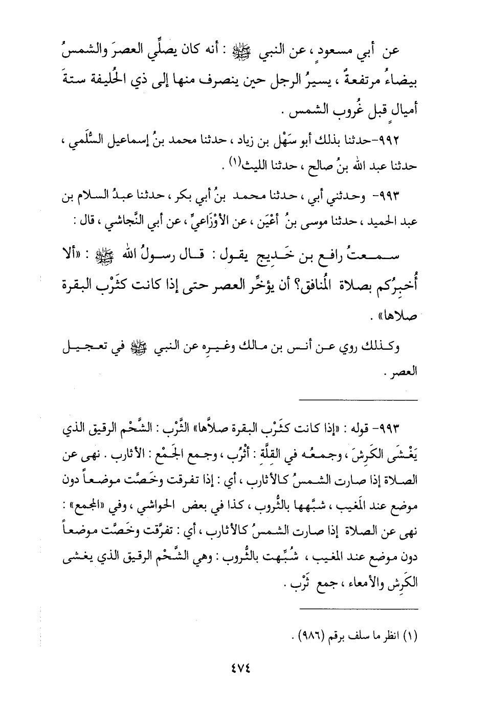 993 - ح وَحَدَّثَنِي أَبِي , أنا مُحَمَّدُ بْنُ أَبِي بَكْرٍ , ثنا عَبْدُ السَّلَامِ بْنُ عَبْدِ الْحَمِيدِ , ثنا مُوسَى بْنُ أَعْيَنَ , عَنِ الْأَوْزَاعِيِّ , عَنْ أَبِي النَّجَاشِيِّ , قَالَ: سَمِعْتُ رَافِعَ بْنَ خَدِيجٍ , يَقُولُ: قَالَ: قَالَ رَسُولُ اللَّهِ صَلَّى اللهُ عَلَيْهِ وَسَلَّمَ: § «أَلَا أُخْبِرُكُمْ بِصَلَاةِ الْمُنَافِقِ؟ , أَنْ يُؤَخِّرَ الْعَصْرَ حَتَّى إِذَا كَانَتْ كَثَرَبِ الْبَقَرَةِ صَلَّاهَا»