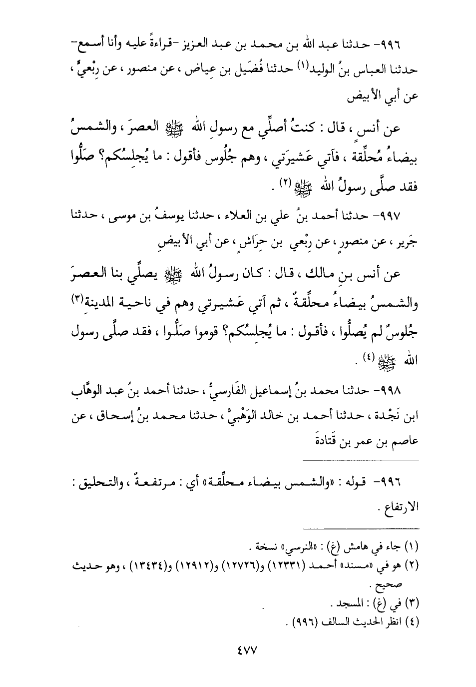 996 - حَدَّثَنَا عَبْدُ اللَّهِ بْنُ مُحَمَّدِ بْنِ عَبْدِ الْعَزِيزِ قِرَاءَةً عَلَيْهِ , ثنا الْعَبَّاسُ بْنُ الْوَلِيدِ النَّرْسِيُّ , ثنا فُضَيْلُ بْنُ عِيَاضٍ , عَنْ مَنْصُورٍ , عَنْ رِبْعِيٍّ , عَنْ أَبِي الْأَبْيَضِ , عَنْ أَنَسٍ , قَالَ: § «كُنْتُ أُصَلِّي مَعَ النَّبِيِّ صَلَّى اللهُ عَلَيْهِ وَسَلَّمَ الْعَصْرَ وَالشَّمْسُ بَيْضَاءُ مُحَلِّقَةٌ» , فَآتِي عَشِيرَتِي وَهُمْ جُلُوسٌ , فَأَقُولُ: مَا يُجْلِسُكُمْ صَلُّوا فَقَدْ صَلَّى رَسُولُ اللَّهِ صَلَّى اللهُ عَلَيْهِ وَسَلَّمَ