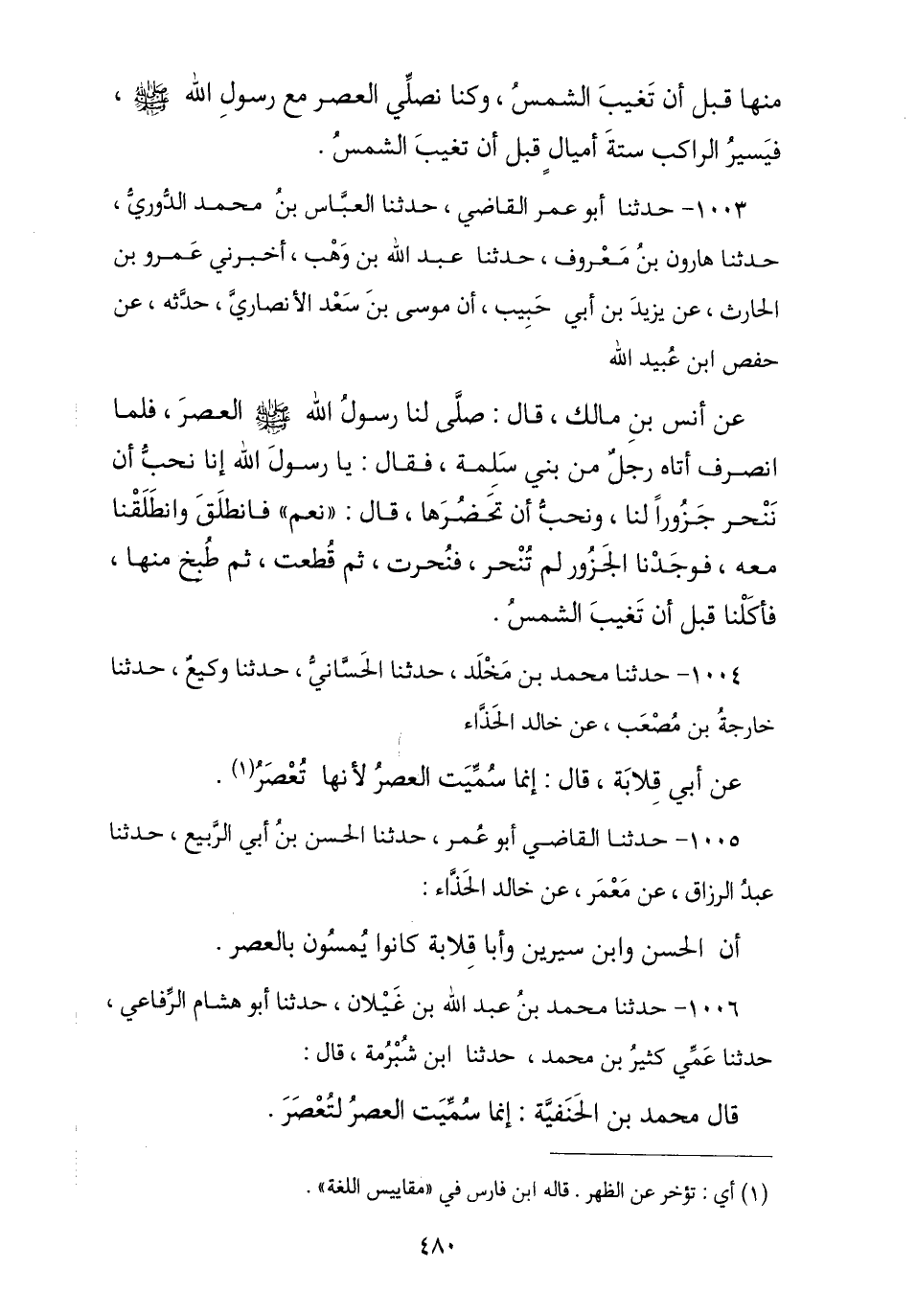 1003 - حَدَّثَنَا أَبُو عُمَرَ الْقَاضِي , ثنا الْعَبَّاسُ بْنُ مُحَمَّدٍ الدُّورِيُّ , نا هَارُونُ بْنُ مَعْرُوفٍ , ثنا عَبْدُ اللَّهِ بْنُ وَهْبٍ , أَخْبَرَنِي عَمْرُو بْنُ الْحَارِثِ , عَنْ يَزِيدَ بْنِ أَبِي حَبِيبٍ , أَنَّ مُوسَى بْنَ سَعْدٍ الْأَنْصَارِيَّ حَدَّثَهُ , عَنْ حَفْصِ بْنِ عُبَيْدِ اللَّهِ , عَنْ أَنَسِ بْنِ مَالِكٍ , قَالَ: §" صَلَّى لَنَا رَسُولُ اللَّهِ صَلَّى اللهُ عَلَيْهِ وَسَلَّمَ الْعَصْرَ , فَلَمَّا انْصَرَفَ أَتَاهُ رَجُلٌ مِنْ بَنِي سَلَمَةَ فَقَالَ: يَا رَسُولَ اللَّهِ صَلَّى اللهُ عَلَيْهِ وَسَلَّمَ إِنَّا نُرِيدُ أَنْ نَنْحَرَ جَزُورًا لَنَا فَنُحِبُّ أَنْ تَحْضُرَنَا , قَالَ: «نَعَمْ» , فَانْطَلَقَ وَانْطَلَقْنَا مَعَهُ فَوَجَدْنَا الْجَزُورَ لَمْ تُنْحَرْ , فَنُحِرَتْ ثُمَّ قُطِعَتْ ثُمَّ طُبِخَ مِنْهَا فَأَكَلْنَا قَبْلَ أَنْ تَغِيبَ الشَّمْسُ "