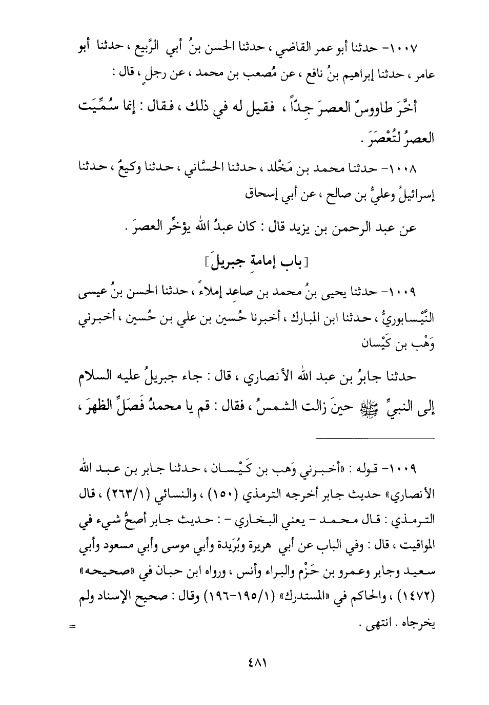 1009 - حَدَّثَنَا يَحْيَى بْنُ مُحَمَّدِ بْنِ صَاعِدٍ إِمْلَاءً , حَدَّثَنَا الْحَسَنُ بْنُ عِيسَى النَّيْسَابُورِيُّ , ثنا ابْنُ الْمُبَارَكِ , أنا الْحُسَيْنُ بْنُ عَلِيِّ بْنِ حُسَيْنٍ , أَخْبَرَنِي وَهْبُ بْنُ كَيْسَانَ , ثنا جَابِرُ بْنُ عَبْدِ اللَّهِ الْأَنْصَارِيُّ , قَالَ: جَاءَ جَبْرَائِيلُ عَلَيْهِ السَّلَامُ إِلَى النَّبِيِّ صَلَّى اللهُ عَلَيْهِ وَسَلَّمَ حِينَ زَالَتِ الشَّمْسُ , فَقَالَ: §قُمْ يَا مُحَمَّدُ فَصَلِّ الظُّهْرَ -[482]- فَقَامَ فَصَلَّى الظُّهْرَ حِينَ زَالَتِ الشَّمْسُ , ثُمَّ مَكَثَ حَتَّى كَانَ فَيْءُ الرَّجُلِ مِثْلَهُ , فَجَاءَهُ الْعَصْرَ فَقَالَ: قُمْ يَا مُحَمَّدُ فَصَلِّ الْعَصْرَ فَقَامَ فَصَلَّى الْعَصْرَ ثُمَّ مَكَثَ حَتَّى غَابَتِ الشَّمْسُ , فَقَالَ: قُمْ فَصَلِّ الْمَغْرِبَ فَقَامَ فَصَلَّاهَا حِينَ غَابَتِ الشَّمْسُ سَوَاءً , ثُمَّ مَكَثَ حَتَّى ذَهَبَ الشَّفَقُ فَجَاءَهُ فَقَالَ: قُمْ فَصَلِّ الْعِشَاءَ فَقَامَ فَصَلَّاهَا , ثُمَّ جَاءَهُ حِينَ سَطَعَ الْفَجْرُ بِالصُّبْحِ فَقَالَ: قُمْ يَا مُحَمَّدُ فَصَلِّ فَقَامَ فَصَلَّى الصُّبْحَ , ثُمَّ جَاءَهُ مِنَ الْغَدِ حِينَ كَانَ فَيْءُ الرَّجُلِ مِثْلَهُ , فَقَالَ: قُمْ يَا مُحَمَّدُ فَصَلِّ الظُّهْرَ فَقَامَ فَصَلَّى الظُّهْرَ , ثُمَّ جَاءَهُ حِينَ كَانَ فَيْءُ الرَّجُلِ مِثْلَيْهِ , فَقَالَ: قُمْ يَا مُحَمَّدُ فَصَلِّ الْعَصْرَ فَقَامَ فَصَلَّى الْعَصْرَ , ثُمَّ جَاءَهُ لِلْمَغْرِبِ حِينَ غَابَتِ الشَّمْسُ وَقْتًا وَاحِدًا لَمْ يَزَلْ عَنْهُ قَالَ: قُمْ فَصَلِّ الْمَغْرِبَ فَصَلَّى الْمَغْرِبَ , ثُمَّ جَاءَهُ لِلْعِشَاءِ حِينَ ذَهَبَ ثُلُثُ اللَّيْلِ الْأَوَّلُ فَقَالَ: قُمْ فَصَلِّ الْعِشَاءَ فَصَلَّى , ثُمَّ جَاءَهُ لِلصُّبْحِ حِينَ أَسْفَرَ جِدًّا , فَقَالَ: قُمْ فَصَلِّ الصُّبْحَ , ثُمَّ قَالَ: مَا بَيْنَ هَذَيْنِ كُلُّهُ وَقْتٌ