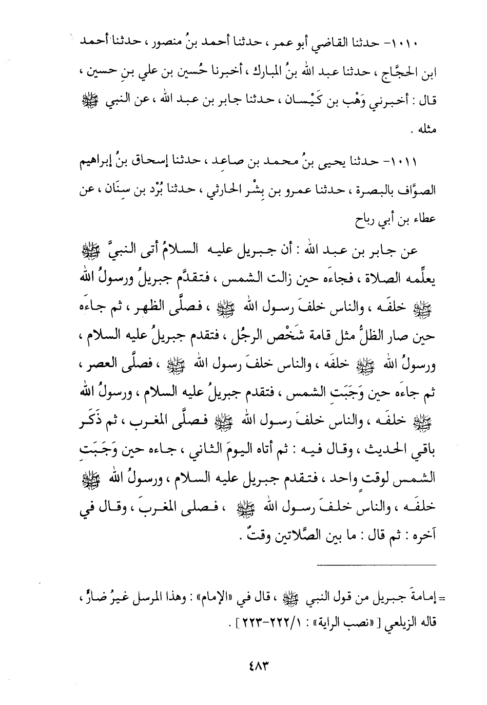 1011 - حَدَّثَنَا يَحْيَى بْنُ مُحَمَّدِ بْنِ صَاعِدٍ , ثنا إِسْحَاقُ بْنُ إِبْرَاهِيمَ الصَّوَّافُ بِالْبَصْرَةِ , ثنا عَمْرُو بْنُ بِشْرٍ الْحَارِثِيُّ , ثنا بُرْدُ بْنُ سِنَانٍ , عَنْ عَطَاءِ بْنِ أَبِي رَبَاحٍ , عَنْ جَابِرِ بْنِ عَبْدِ اللَّهِ: أَنَّ جَبْرَائِيلَ عَلَيْهِ السَّلَامُ أَتَى النَّبِيَّ صَلَّى اللهُ عَلَيْهِ وَسَلَّمَ يُعَلِّمُهُ الصَّلَاةَ , فَجَاءَهُ حِينَ زَالَتِ الشَّمْسُ فَتَقَدَّمَ جَبْرَائِيلُ وَرَسُولُ اللَّهِ صَلَّى اللهُ عَلَيْهِ وَسَلَّمَ خَلْفَهُ وَالنَّاسُ خَلْفَ رَسُولِ اللَّهِ صَلَّى اللهُ عَلَيْهِ وَسَلَّمَ فَصَلَّى الظُّهْرَ , ثُمَّ جَاءَهُ حِينَ صَارَ الظِّلُّ مِثْلَ قَامَةِ شَخْصِ الرَّجُلِ , فَتَقَدَّمَ جَبْرَائِيلُ وَرَسُولُ اللَّهِ صَلَّى اللهُ عَلَيْهِ وَسَلَّمَ خَلْفَهُ وَالنَّاسُ خَلْفَ رَسُولِ اللَّهِ صَلَّى اللهُ عَلَيْهِ وَسَلَّمَ فَصَلَّى الْعَصْرَ , ثُمَّ جَاءَهُ حِينَ وَجَبَتِ الشَّمْسُ فَتَقَدَّمَ جَبْرَائِيلُ عَلَيْهِ السَّلَامُ وَرَسُولُ اللَّهِ صَلَّى اللهُ عَلَيْهِ وَسَلَّمَ خَلْفَهُ وَالنَّاسُ خَلْفَ رَسُولِ اللَّهِ صَلَّى اللهُ عَلَيْهِ وَسَلَّمَ فَصَلَّى الْمَغْرِبَ , ثُمَّ ذَكَرَ بَاقِيَ الْحَدِيثِ وَقَالَ فِيهِ: ثُمَّ أَتَاهُ الْيَوْمَ الثَّانِيَ حِينَ وَجَبَتِ الشَّمْسُ لِوَقْتٍ وَاحِدٍ فَتَقَدَّمَ جَبْرَائِيلُ عَلَيْهِ السَّلَامُ وَرَسُولُ اللَّهِ صَلَّى اللهُ عَلَيْهِ وَسَلَّمَ خَلْفَهُ وَالنَّاسُ خَلْفَ رَسُولِ اللَّهِ صَلَّى اللهُ عَلَيْهِ وَسَلَّمَ فَصَلَّى الْمَغْرِبَ , وَقَالَ فِي آخِرِهِ: ثُمَّ قَالَ: مَا بَيْنَ الصَّلَاتَيْنِ وَقْتٌ -[484]- قَالَ: فَسَأَلَ رَجُلٌ رَسُولَ اللَّهِ صَلَّى اللهُ عَلَيْهِ وَسَلَّمَ عَنِ الصَّلَاةِ , فَصَلَّى بِهِمْ كَمَا صَلَّى بِهِ جَبْرَائِيلُ عَلَيْهِ السَّلَامُ , ثُمَّ قَالَ: § «أَيْنَ السَّائِلُ عَنِ الصَّلَاةِ؟ , مَا بَيْنَ الصَّلَاتَيْنِ وَقْتٌ»
