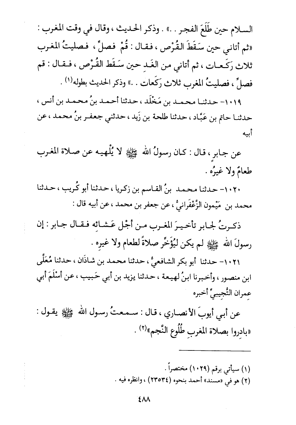1021 - حَدَّثَنَا أَبُو بَكْرٍ الشَّافِعِيُّ , نا مُحَمَّدُ بْنُ شَاذَانَ , ثنا مُعَلَّى بْنُ مَنْصُورٍ , أنا ابْنُ لَهِيعَةَ , ثنا يَزِيدُ بْنُ أَبِي حَبِيبٍ , عَنْ أَسْلَمَ أَبِي عِمْرَانَ التُّجِيبِيِّ , عَنْ أَبِي أَيُّوبَ الْأَنْصَارِيِّ , قَالَ: سَمِعْتُ رَسُولَ اللَّهِ صَلَّى اللهُ عَلَيْهِ وَسَلَّمَ يَقُولُ: § «بَادِرُوا بِصَلَاةِ الْمَغْرِبِ طُلُوعَ النَّجْمِ»