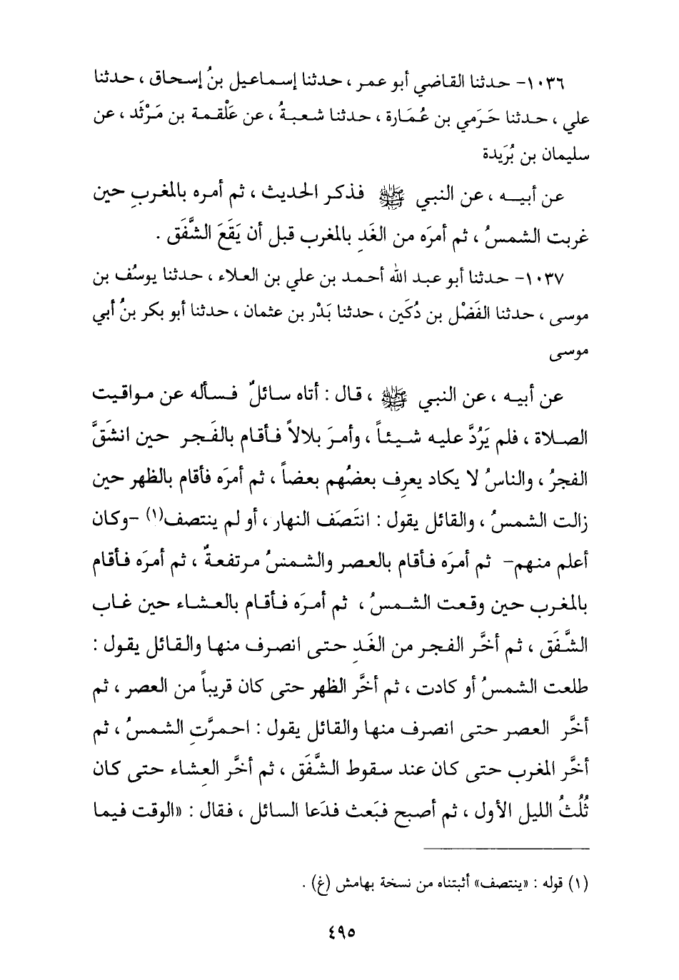 1036 - حَدَّثَنَا الْقَاضِي أَبُو عُمَرَ , نا إِسْمَاعِيلُ بْنُ إِسْحَاقَ , نا عَلِيُّ , ثنا حِرْمِيُّ بْنُ عُمَارَةَ , نا شُعْبَةُ , عَنْ عَلْقَمَةَ بْنِ مَرْثَدٍ , عَنْ سُلَيْمَانَ بْنِ بُرَيْدَةَ , عَنْ أَبِيهِ , عَنِ النَّبِيِّ صَلَّى اللهُ عَلَيْهِ وَسَلَّمَ فَذَكَرَ الْحَدِيثَ «ثُمَّ أَمَرَهُ بِالْمَغْرِبِ حِينَ غَرَبَتِ الشَّمْسُ §ثُمَّ أَمَرَهُ مِنَ الْغَدِ بِالْمَغْرِبِ قَبْلَ أَنْ يَقَعَ الشَّفَقُ»