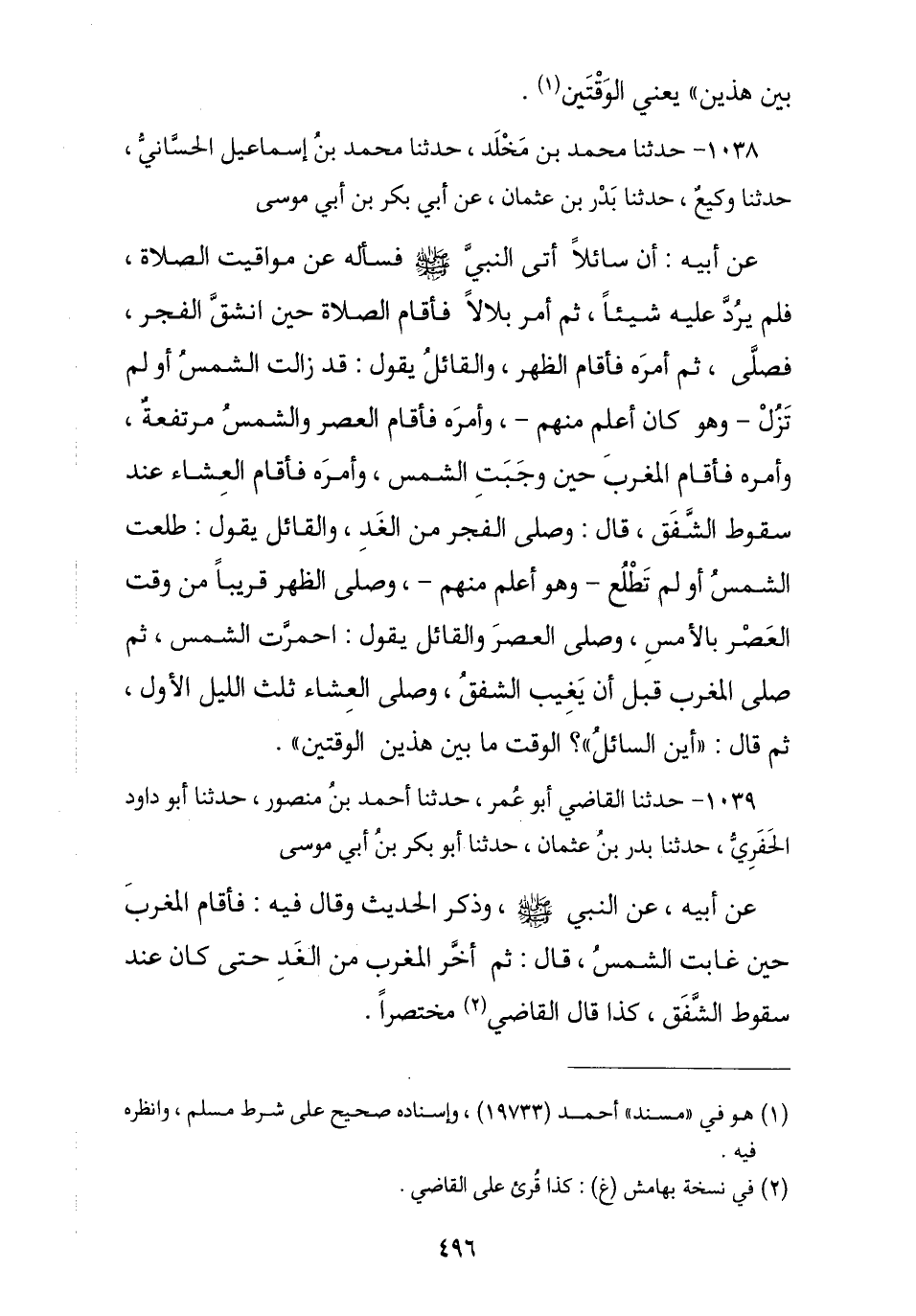 1038 - نا مُحَمَّدُ بْنُ مَخْلَدٍ , نا مُحَمَّدُ بْنُ إِسْمَاعِيلَ الْحَسَّانِيُّ , نا وَكِيعٌ , ثنا بَدْرُ بْنُ عُثْمَانَ , عَنْ أَبِي بَكْرِ بْنِ أَبِي مُوسَى , عَنْ أَبِيهِ , أَنَّ سَائِلًا أَتَى النَّبِيَّ صَلَّى اللهُ عَلَيْهِ وَسَلَّمَ فَسَأَلَهُ عَنْ مَوَاقِيتِ الصَّلَاةِ فَلَمْ يَرُدَّ عَلَيْهِ شَيْئًا ثُمَّ أَمَرَ بِلَالًا فَأَقَامَ الصَّلَاةَ حِينَ انْشَقَّ الْفَجْرُ فَصَلَّى , ثُمَّ أَمَرَهُ فَأَقَامَ الظُّهْرَ وَالْقَائِلُ يَقُولُ: قَدْ زَالَتِ الشَّمْسُ أَوْ لَمْ تَزُلْ وَهُوَ كَانَ أَعْلَمَ مِنْهُمْ , ثُمَّ أَمَرَهُ فَأَقَامَ الْعَصْرَ وَالشَّمْسُ مُرْتَفِعَةٌ , وَأَمَرَهُ فَأَقَامَ الْمَغْرِبَ حِينَ وَجَبَتِ الشَّمْسُ , وَأَمَرَهُ فَأَقَامَ الْعِشَاءَ عِنْدَ سُقُوطِ الشَّفَقِ , قَالَ: وَصَلَّى الْفَجْرَ مِنَ الْغَدِ وَالْقَائِلُ يَقُولُ: طَلَعَتِ الشَّمْسُ أَوْ لَمْ تَطْلُعْ وَهُوَ أَعْلَمُ مِنْهُمْ , وَصَلَّى الظُّهْرَ قَرِيبًا مِنْ وَقْتِ الْعَصْرِ بِالْأَمْسِ , وَصَلَّى الْعَصْرَ وَالْقَائِلُ يَقُولُ: احْمَرَّتِ الشَّمْسُ , ثُمَّ صَلَّى الْمَغْرِبَ قَبْلَ أَنْ يَغِيبَ الشَّفَقُ , وَصَلَّى الْعِشَاءَ ثُلُثَ اللَّيْلِ الْأَوَّلَ , ثُمَّ قَالَ: «أَيْنَ السَّائِلُ؟ §الْوَقْتُ مَا بَيْنَ هَذَيْنِ الْوَقْتَيْنِ»