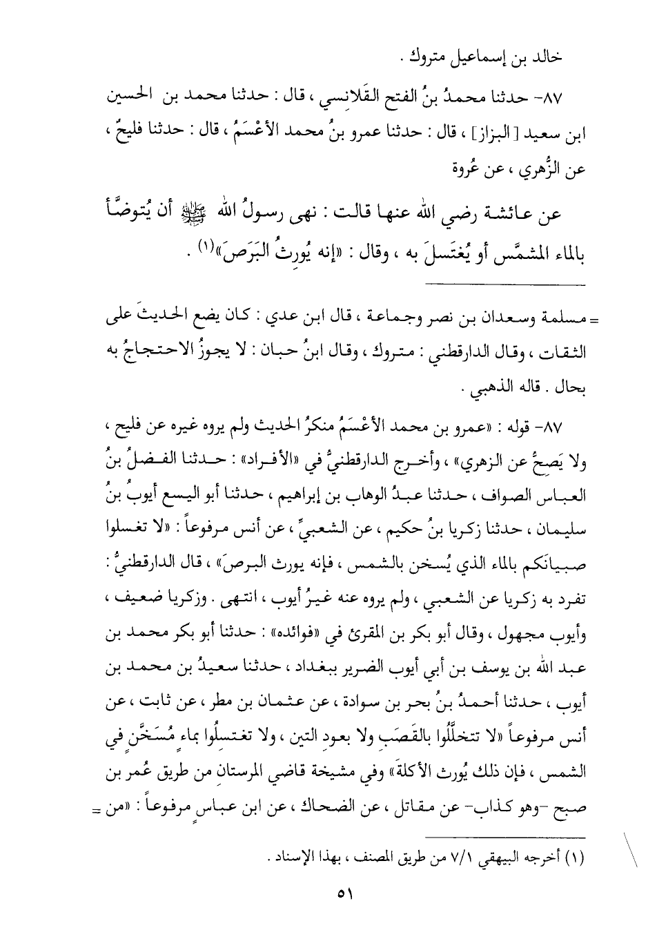 87 - نا مُحَمَّدُ بْنُ الْفَتْحِ الْقَلَانِسِيُّ , نا مُحَمَّدُ بْنُ الْحُسَيْنِ بْنِ سَعِيدٍ الْبَزَّازُ , نا عَمْرُو بْنُ مُحَمَّدٍ الْأَعْشَمُ , نا فُلَيْحٌ , عَنِ الزُّهْرِيِّ , عَنْ عُرْوَةَ , عَنْ عَائِشَةَ , قَالَتْ: نَهَى رَسُولُ اللَّهِ صَلَّى اللهُ عَلَيْهِ وَسَلَّمَ أَنْ يُتَوَضَّأَ بِالْمَاءِ الْمُشَمَّسِ أَوْ يُغْتَسَلَ بِهِ , وَقَالَ: «إِنَّهُ §يُورِثُ الْبَرَصَ». -[52]- عَمْرُو بْنُ مُحَمَّدٍ الْأَعْشَمُ مُنْكَرُ الْحَدِيثِ , وَلَمْ يَرْوِهِ عَنْ فُلَيْحٍ غَيْرُهُ , وَلَا يَصِحُّ عَنِ الزُّهْرِيِّ