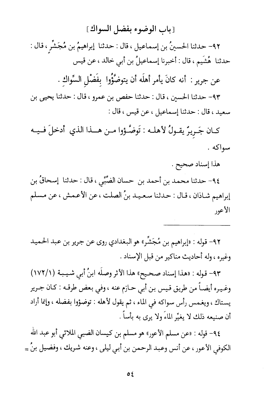 93 - نا الْحُسَيْنُ , نا حَفْصُ بْنُ عَمْرٍو , نا يَحْيَى بْنُ سَعِيدٍ , نا إِسْمَاعِيلُ , ثنا قَيْسٌ , قَالَ: كَانَ جَرِيرٌ يَقُولُ لِأَهْلِهِ § «تَوَضَّئُوا مِنْ هَذَا الَّذِي أَدْخَلَ فِيهِ سِوَاكَهُ». هَذَا إِسْنَادٌ صَحِيحٌ