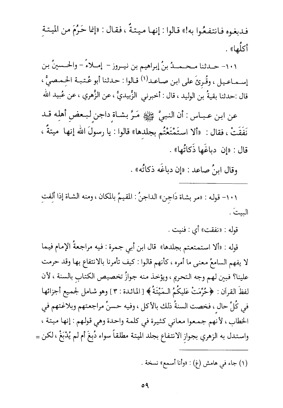 101 - حَدَّثَنَا مُحَمَّدُ بْنُ إِبْرَاهِيمَ بْنِ نَيْرُوزَ إِمْلَاءً , وَالْحُسَيْنُ بْنُ إِسْمَاعِيلَ , وَقُرِئَ عَلَى ابْنِ صَاعِدٍ وَأَنَا أَسْمَعُ , قَالُوا: نا أَبُو عُتْبَةَ الْحِمْصِيُّ , نا بَقِيَّةُ بْنُ الْوَلِيدِ , نا الزُّبَيْدِيُّ , عَنِ الزُّهْرِيِّ , عَنْ عُبَيْدِ اللَّهِ بْنِ عَبْدِ اللَّهِ , عَنِ ابْنِ عَبَّاسٍ , أَنَّ النَّبِيَّ صَلَّى اللهُ عَلَيْهِ وَسَلَّمَ مَرَّ بِشَاةٍ دَاجِنٍ لِبَعْضِ أَهْلِهِ قَدْ نَفَقَتْ , فَقَالَ: «أَلَا اسْتَمْتَعْتُمْ بِجِلْدِهَا؟» قَالُوا: يَا رَسُولَ اللَّهِ إِنَّهَا مَيْتَةٌ , قَالَ: «إِنَّ §دِبَاغَهَا ذَكَاتُهَا». وَقَالَ ابْنُ صَاعِدٍ: إِنَّ دِبَاغَهُ ذَكَاتُهُ -[62]-.