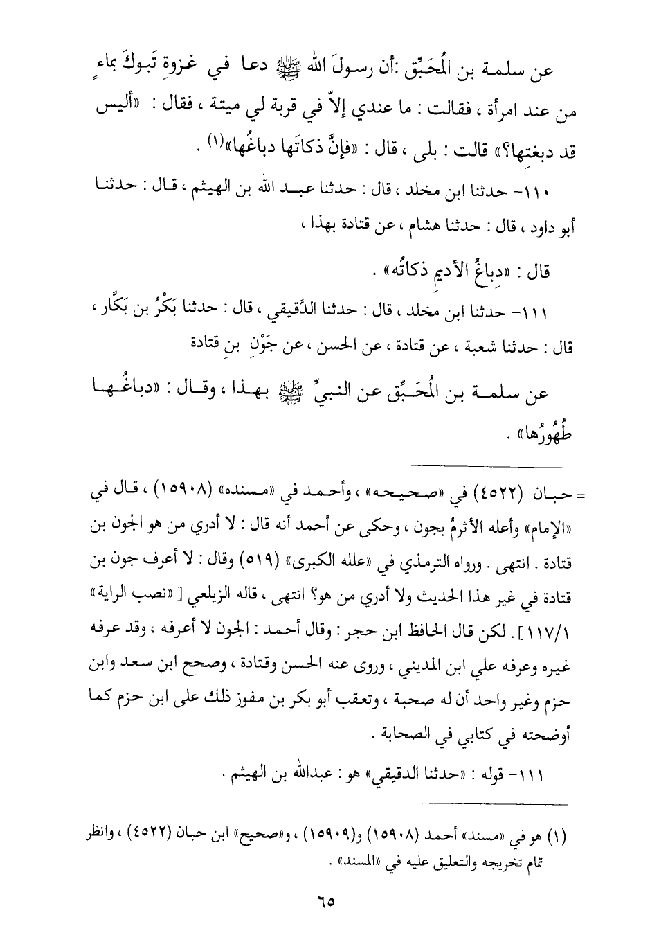 111 - حَدَّثَنَا ابْنُ مَخْلَدٍ , ثنا الدَّقِيقِيُّ , ثنا بَكْرُ بْنُ بَكَّارٍ , ثنا شُعْبَةُ , عَنْ قَتَادَةَ , عَنِ الْحَسَنِ , عَنْ جَوْنِ بْنِ قَتَادَةَ , عَنْ سَلَمَةَ بْنِ الْمُحَبَّقِ , عَنِ النَّبِيِّ صَلَّى اللهُ عَلَيْهِ وَسَلَّمَ بِهَذَا قَالَ: § «دِبَاغُهَا طَهُورُهَا»