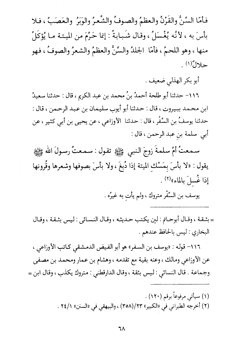 116 - نا أَبُو طَلْحَةَ أَحْمَدُ بْنُ مُحَمَّدِ بْنِ عَبْدِ الْكَرِيمِ , نا سَعِيدُ بْنُ مُحَمَّدٍ بِبَيْرُوتَ , نا أَبُو أَيُّوبَ سُلَيْمَانُ بْنُ عَبْدِ الرَّحْمَنِ , نا يُوسُفُ بْنُ السَّفَرِ , نا الْأَوْزَاعِيُّ , عَنْ يَحْيَى بْنِ أَبِي كَثِيرٍ , عَنْ أَبِي سَلَمَةَ بْنِ عَبْدِ الرَّحْمَنِ , قَالَ: سَمِعْتُ أُمَّ سَلَمَةَ زَوْجَ النَّبِيِّ صَلَّى اللهُ عَلَيْهِ وَسَلَّمَ , تَقُولُ: سَمِعْتُ رَسُولَ اللَّهِ صَلَّى اللهُ عَلَيْهِ وَسَلَّمَ يَقُولُ: § «لَا بَأْسَ بِمِسْكِ الْمَيْتَةِ إِذَا دُبِغَ , وَلَا بَأْسَ بِصُوفِهَا وَشَعْرِهَا وَقُرُونِهَا إِذَا غُسِلَ بِالْمَاءِ». يُوسُفُ بْنُ السَّفَرِ مَتْرُوكٌ , وَلَمْ يَأْتِ بِهِ غَيْرُهُ -[69]-