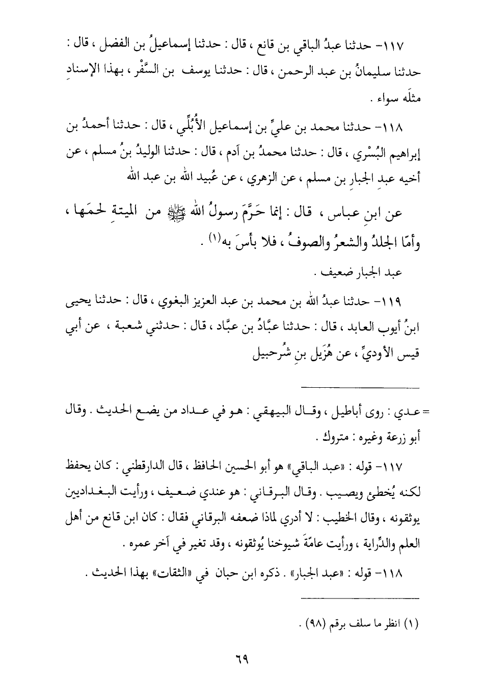 118 - حَدَّثَنَا مُحَمَّدُ بْنُ عَلِيِّ بْنِ إِسْمَاعِيلَ الْأَيْلِيُّ , نا أَحْمَدُ بْنُ إِبْرَاهِيمَ الْبُسْرِيُّ , نا مُحَمَّدُ بْنُ آدَمَ , نا الْوَلِيدُ بْنُ مُسْلِمٍ , عَنْ أَخِيهِ عَبْدِ الْجَبَّارِ بْنِ مُسْلِمٍ , عَنِ الزُّهْرِيِّ , عَنْ عُبَيْدِ اللَّهِ بْنِ عَبْدِ اللَّهِ , عَنِ ابْنِ عَبَّاسٍ , قَالَ: «إِنَّمَا حَرَّمَ رَسُولُ اللَّهِ صَلَّى اللهُ عَلَيْهِ وَسَلَّمَ مِنَ الْمَيْتَةِ لَحْمَهَا §وَأَمَّا الْجِلْدُ وَالشَّعْرُ وَالصُّوفُ فَلَا بَأْسَ بِهِ» عَبْدُ الْجَبَّارِ ضَعِيفٌ
