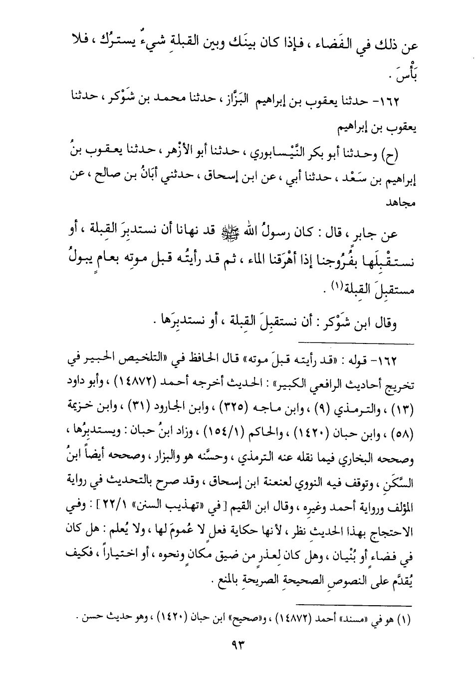 162 - نا يَعْقُوبُ بْنُ إِبْرَاهِيمَ الْبَزَّازُ , نا مُحَمَّدُ بْنُ شَوْكَرٍ , نا يَعْقُوبُ بْنُ إِبْرَاهِيمَ , ح وَحَدَّثَنَا أَبُو بَكْرٍ النَّيْسَابُورِيُّ , حَدَّثَنَا أَبُو الْأَزْهَرِ , نا يَعْقُوبُ بْنُ إِبْرَاهِيمَ بْنِ سَعْدٍ , نا أَبِي , عَنِ ابْنِ إِسْحَاقَ , حَدَّثَنِي أَبَانُ بْنُ صَالِحٍ , عَنْ مُجَاهِدٍ , عَنْ جَابِرٍ , قَالَ: كَانَ رَسُولُ اللَّهِ صَلَّى اللهُ عَلَيْهِ وَسَلَّمَ «قَدْ نَهَانَا §أَنْ نَسْتَدْبِرَ الْقِبْلَةَ أَوْ نَسْتَقْبِلَهَا بِفُرُوجِنَا إِذَا أَهْرَقْنَا الْمَاءَ , ثُمَّ قَدْ رَأَيْتُهُ قَبْلَ مَوْتِهِ بِعَامٍ يَبُولُ مُسْتَقْبِلَ الْقِبْلَةِ». كُلُّهُمْ ثِقَاتٌ , وَقَالَ ابْنُ شَوْكَرٍ: أَنْ يَسْتَقْبِلَ الْقِبْلَةَ أَوْ يَسْتَدْبِرَهَا