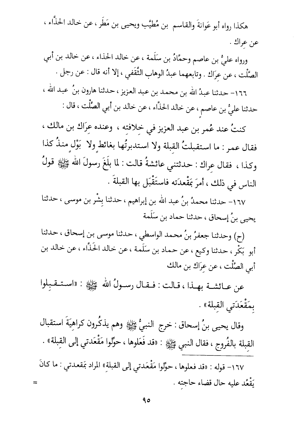167 - نا مُحَمَّدُ بْنُ عَبْدِ اللَّهِ بْنِ إِبْرَاهِيمَ , نا بِشْرُ بْنُ مُوسَى , نا يَحْيَى بْنُ إِسْحَاقَ , نا حَمَّادُ بْنُ سَلَمَةَ , ح وَثنا جَعْفَرُ بْنُ مُحَمَّدٍ الْوَاسِطِيُّ , نا مُوسَى بْنُ إِسْحَاقَ , نا أَبُو بَكْرٍ , نا وَكِيعٌ , عَنْ حَمَّادِ بْنِ سَلَمَةَ , عَنْ خَالِدٍ الْحَذَّاءِ , عَنْ خَالِدِ بْنِ أَبِي الصَّلْتِ , عَنْ عِرَاكِ بْنِ مَالِكٍ , عَنْ عَائِشَةَ , بِهَذَا قَالَتْ: فَقَالَ رَسُولُ اللَّهِ صَلَّى اللهُ عَلَيْهِ وَسَلَّمَ: «§اسْتَقْبِلُوا بِمَقْعَدَتِي الْقِبْلَةَ». وَقَالَ يَحْيَى بْنُ إِسْحَاقَ: خَرَجَ النَّبِيُّ صَلَّى اللهُ عَلَيْهِ وَسَلَّمَ وَهُمْ يَذْكُرُونَ كَرَاهِيَةَ اسْتِقْبَالِ الْقِبْلَةِ بِالْفُرُوجِ , فَقَالَ النَّبِيُّ صَلَّى اللهُ عَلَيْهِ وَسَلَّمَ: «قَدْ فَعَلُوهَا حَوِّلُوا مَقْعَدَتِي إِلَى الْقِبْلَةِ» , وَهَذَا مِثْلُهُ