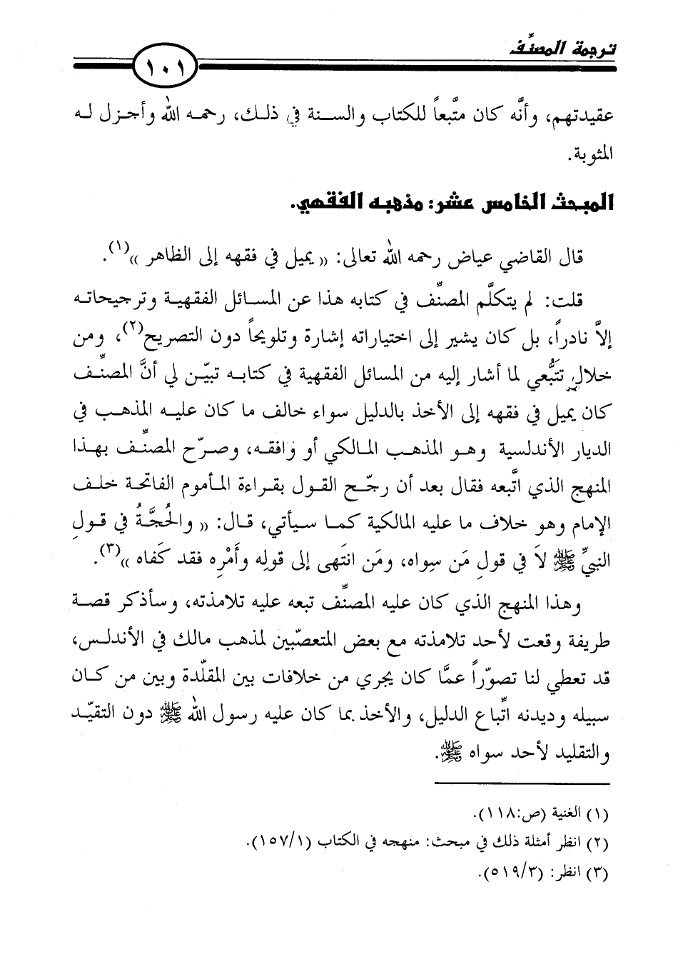 قلت: لم يتكلَّم المصنِّف في كتابه هذا عن المسائل الفقهية وترجيحاته إلا نادراً، بل كان يضير إلى اختياراته إشارة وتلويحًا دون التصريح (٢)، ومن خلال تتَبُّعي لما أشار إليه من المسائل الفقهية في كتابه تبيّن لي أنَّ المصنِّف كان يميل في فقهه إلى الأخذ بالدليل سواء خالف ما كان عليه المذهب في الديار الأندلسية وهو المذهب المالكي أو وافقه، وصرّح المصنِّف بهذا المنهج الذي اتَّبعه فقال بعد أن رجّح القول بقراءة المأموم الفاتحة خلف الإمام وهو خلاف ما عليه المالكية كما سيأتي، قال: "والحُجَّةُ قول النبيِّ - صلى الله عليه وسلم - لاَ في قولِ مَن سِواه، ومَن انتَهى إلى قولِه وأَمْرِه فقد كَفاه" (٣).