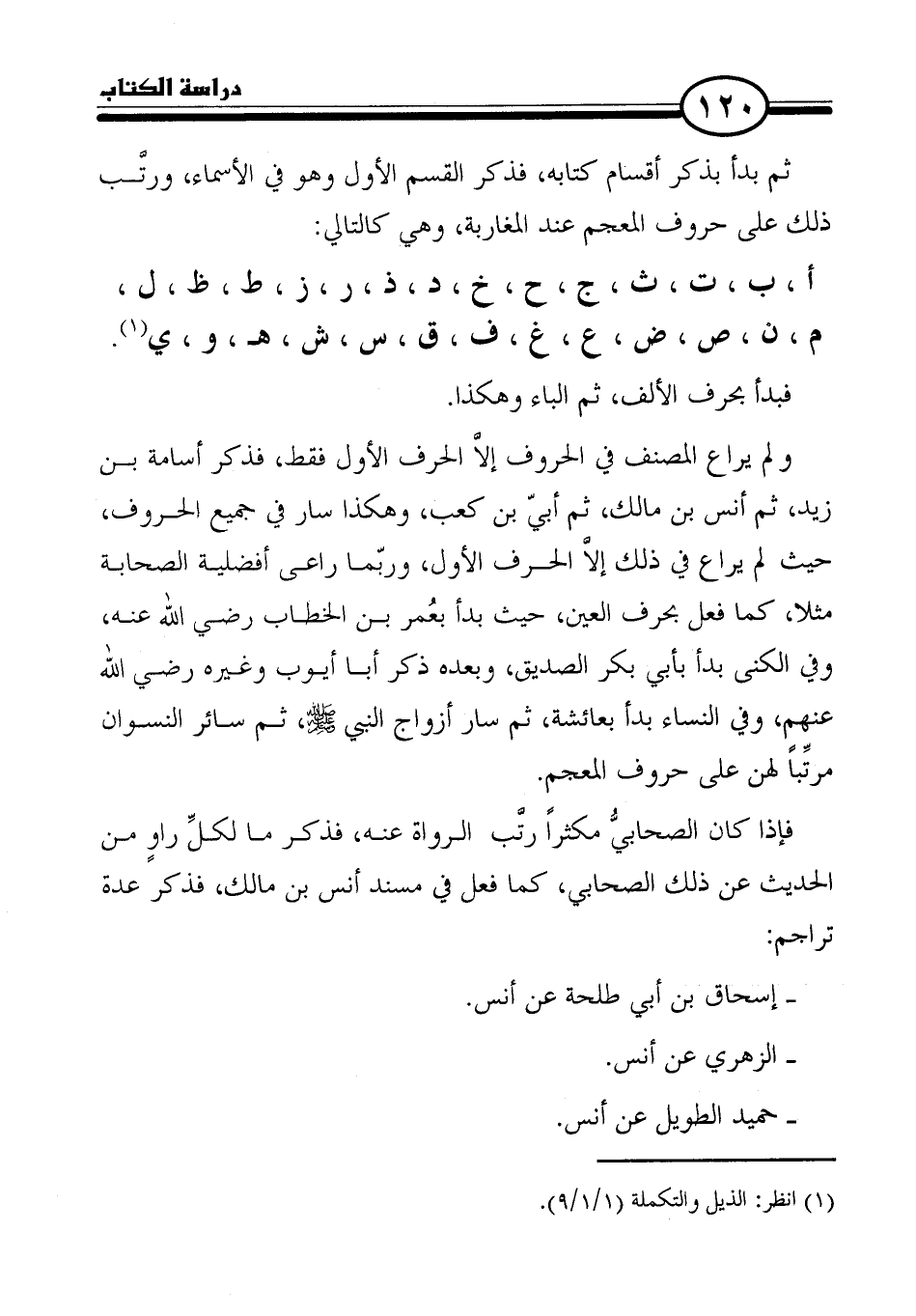 ولم يراع الصنف في الحروف إلَّا الحرف الأول فقط، فذكر أسامة بن زيد، ثم أنس بن مالك، ثم أبيّ بن كعب، وهكذا سار في جميع الحروف، حيث لم يراع في ذلك إلَّا الحرف الأول، وربّما راعى أفضلية الصحابة مثلا، كما فعل بحرف العين، حيث بدأ بعُمر بن الخطاب رضي الله عنه، وفي الكنى بدأ بأبي بكر الصديق، وبعده ذكر أبا أيوب وغيره رضي الله عنهم، وفي النساء بدأ بعائشة، ثم سار أزواج النبي - صلى الله عليه وسلم -، ثم سائر النسوان مرتِّبًا لهن على حروف المعجم.