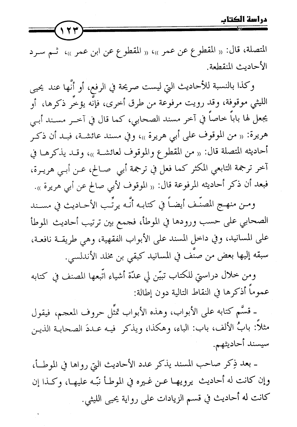 - بعد ذِكر صاحب المسند يذكر عدد الأحاديث التي رواها في الموطأ، وإن كانت له أحاديث يرويها عن غيره في الموطأ نبّه عليها، وكذا إن كانت له أحاديث في قسم الزيادات على رواية يحيى الليثي.