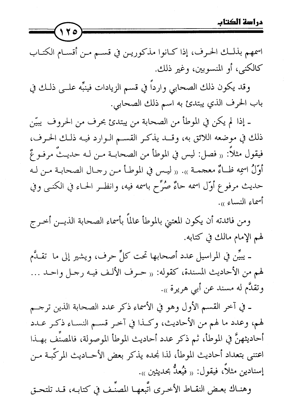 - إذا لم يكن في الموطأ من الصحابة من يبتدئ بحرف من الحروف يبيّن ذلك في موضعه اللائق به، وقد يذكر القعسم الوارد فيه ذلك الحرف، فيقول مثلًا: "فصل: ليس في الموطأ من الصحابة من له حديثٌ مرفوعٌ أوّلُ اسمِه ظاءٌ معجمة". "ليس في الموطأ من رجال الصحابة من له حديث مرفوع أوّل اسمه حاءٌ صُرِّح باسمه فيه، وانظر الحاء في الكنى وفي أسماء النساء".