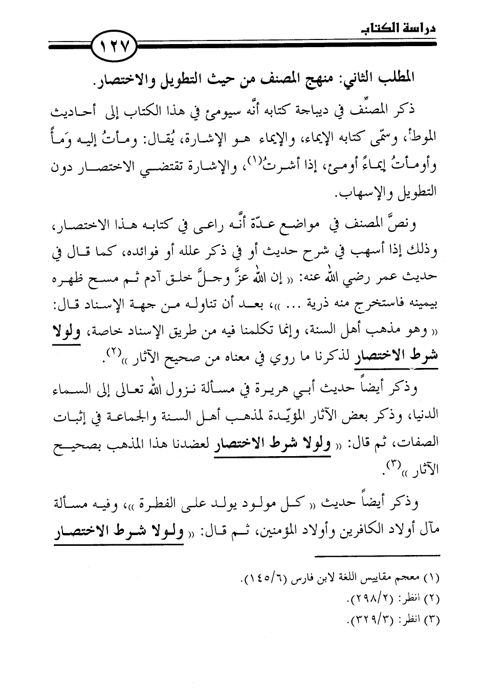 وذكر أيضًا حديث أبي هريرة في مسألة نزول الله تعالى إلى السماء الدنيا، وذكر بعض الآثار المؤيّدة لمذهب أهل السنة والجماعة في إثبات الصفات، ثم قال: "ولولا شرط الاختصار لعضدنا هذا المذهب بصحيح الآثار" (٣).