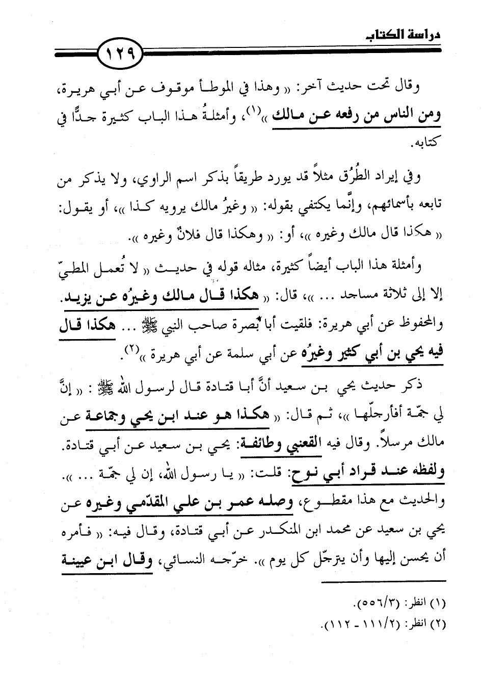 وأمثلة هذا الباب أيضًا كثيرة، مثاله قوله في حديث "لا تُعمل المطيّ إلا إلى ثلاثة مساجد ... "، قال: "هكذا قال مالك وغيرُه عن يزيد. والمحفوظ عن أبي هريرة: فلقيت أبا بصرة صاحب النبي - صلى الله عليه وسلم - ... هكذا قال فيه يحيى بن أبي كثير وغيرُه عن أبي سلمة عن أبي هريرة" (٢).