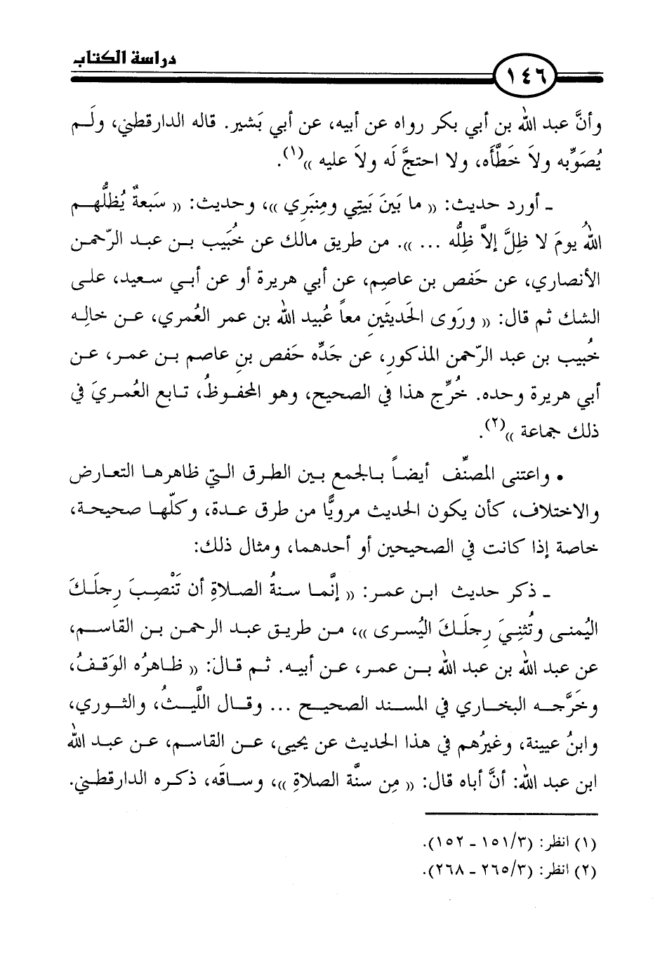 - ذكر حديث ابن عمر: "إنَّما سنةُ الصلاةِ أن تَنْصِبَ رِجلَكَ اليُمنى وتُثنِيَ رِجلَكَ اليُسرى"، من طريق عبد الرحمن بن القاسم، عنِ عبد الله بن عبد الله بن عمر، عن أبيه. ثم قال: "ظاهرُه الوَقفُ، وخرَّجه البخاري في المسند الصحيح ... وقال اللَّيثُ، والثوري، وابن عيينة، وغيرُهم في هذا الحديث عن يحيى، عن القاسم، عن عبد الله بن عبد الله: أنَّ أباه قال: "مِن سنَّة الصلاةِ"، وساقَه، ذكره الدارقطني.