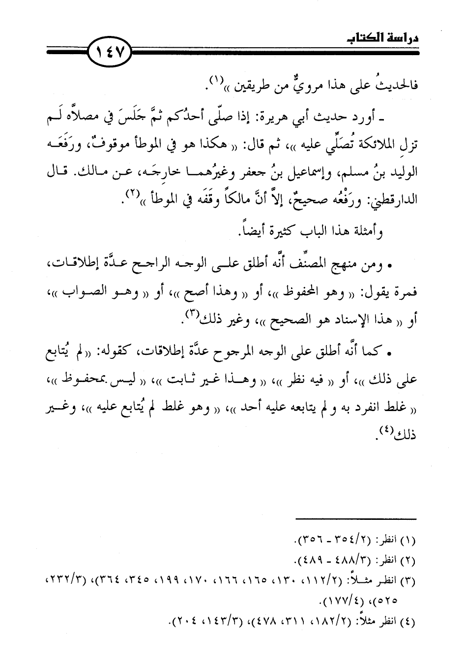 - أورد حديث أبي هريرة: إذا صلّى أحدُكم ثمَّ جَلَسَ فِي مصلَّاه لَم تزلِ الملائكة تُصَلِّي عليه"، ثم قال: "هكذا هو في الموطأ موقوفٌ، ورَفَعَه الوليد بنُ مسلم، وإسماعيل بنُ جعفر وغيرُهما خارِجَه، عن مالك. قال الدارقطني: ورَفْعُه صحيحٌ، إلَّا أنَّ مالكًا وقَفَه فى الموطأ" (٢).
