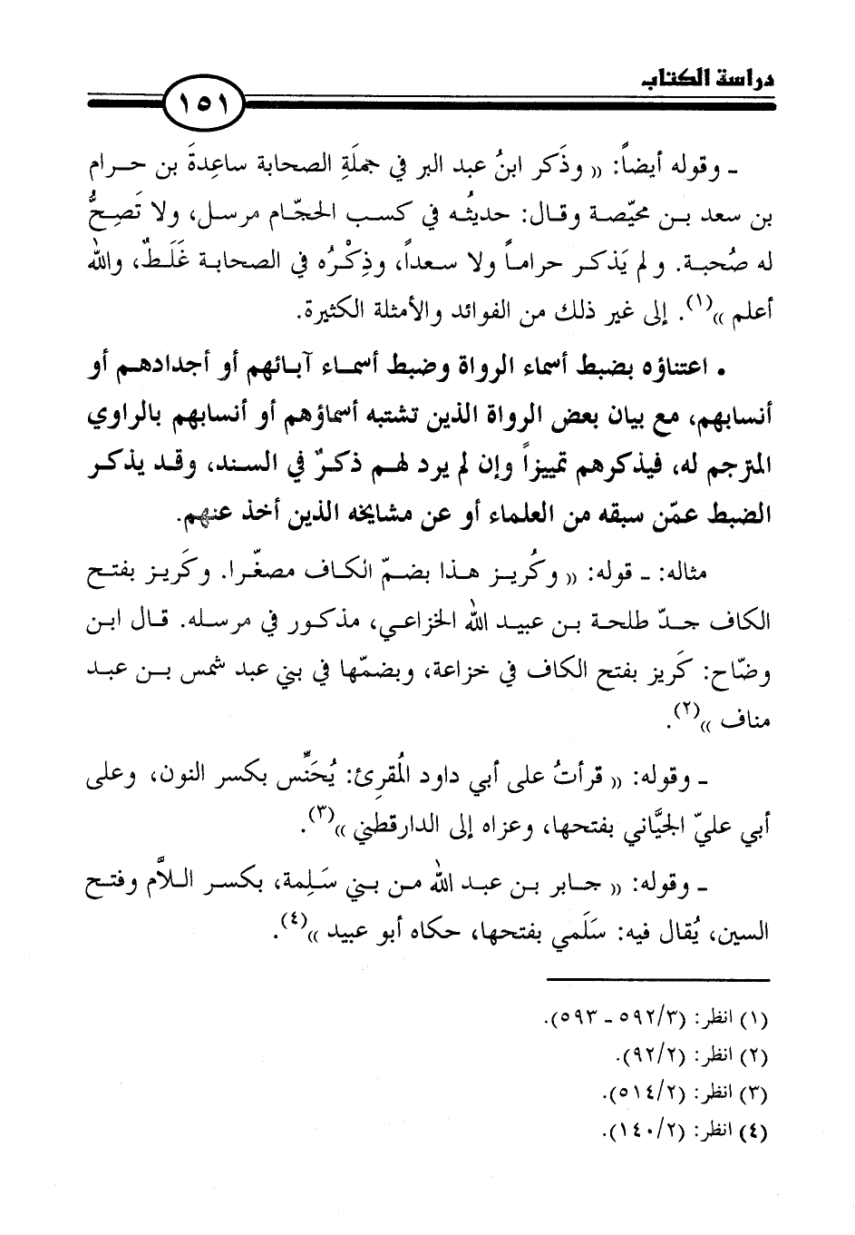 - وقوله أيضًا: "وذَكر ابنُ عبد البر في جملَةِ الصحابة ساعِدةَ بن حرام بن سعد بن محيّصة وقال: حديثُه في كسب الحجّام مرسل، ولا تَصِحُّ له صُحبة. ولم يَذكر حرامًا ولا سعدًا، وذِكْرُه في الصحابهْ غَلَطٌ، والله أعلم" (١). إلى غير ذلك من الفوائد والأمثلة الكثيرة.