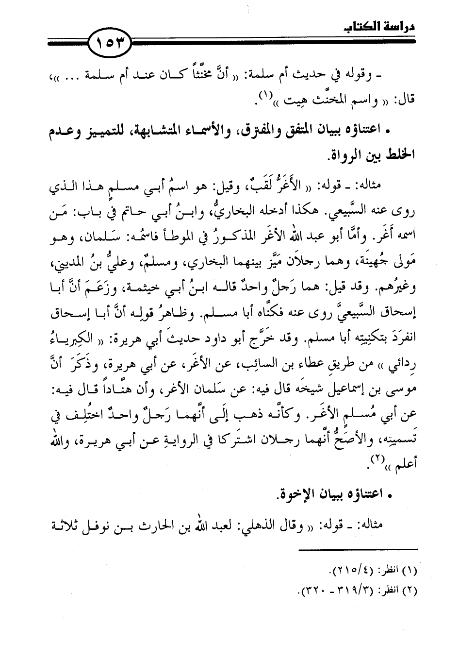 مثاله: - قوله: "الأَغَرُّ لَقَبٌ، وقيل: هو اسمُ أبي مسلمٍ هذا الذي روى عنه السَّبيعي. هكذا أدخله البخاريُّ، وابنُ أبي حاتم في باب: مَن اسمه أَغَر. وأمَّا أبو عبد الله الأغَر المذكورُ في الموطأ فاسمُه: سَلمان، وهو مَولى جُهينَة، وهما رجلَان مَيَّز بينهما البخاري، ومسلمٌ، وعليُّ بنُ المديني، وغيرُهم. وقد قيل: هما رَجلٌ واحدٌ قاله ابنُ أبي خيثمة، وزَعَمَ أنَّ أبا إسحاق السَّبيعيَّ روى عنه فكنَّاه أبا مسلم. وظاهرُ قوله أنَّ أبا إسحاق انفرَدَ بتكنِيتِه أبا مسلم. وقد خَرَّج أبو داود حديثَ أبي هريرة: "الكِبرياءُ رِدائي" من طريقِ عطاء بن السائِب، عن الأغَر، عن أبي هريرة، وذَكَرَ أنَّ موسى بن إسماعيل شيخَه قال فيه: عن سَلمان الأغر، وأن هنَّادًا قال فيه: عن أبي مُسلمٍ الأغَر. وكأنَّه ذهب إلَى أنَّهما رَجلٌ واحدٌ اختُلِف في تَسميته، والأصَحُّ أنَّهما رجلان اشتَركا في الروايةِ عن أبي هريرة، والله أعلم" (٢).