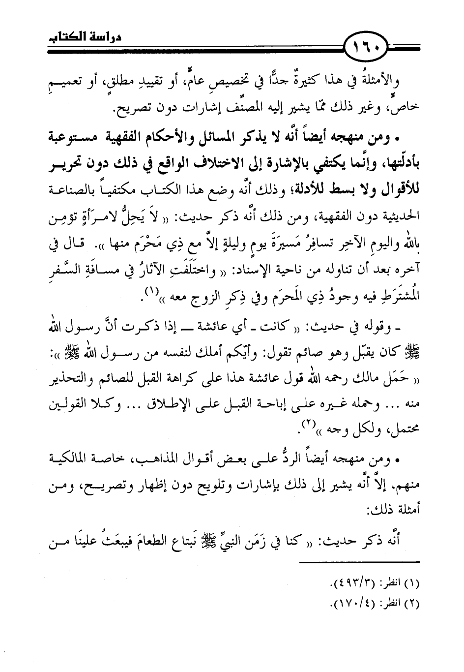 • ومن منهجه أيضًا أنَّه لا يذكر المسائل والأحكام الفقهية مستوعبة بأدلّتها، وإنَّما يكتفي بالأشارة إلى الاختلاف الواقع في ذلك دون تحرير للأقوال ولا بسط للأدلة؛ وذلك أنَّه وضع هذا الكتاب مكتفيًا بالصناعة الحديثية دون الفقهية، ومن ذلك أنَّه ذكر حديث: "لَا يَحِلُّ لامرَأةٍ تؤمِن بالله واليومِ الآخِر تسافِرُ مَسيرَةَ يومٍ وليلةٍ إلَّا مع ذِي مَحْرَم منها". قال في آخره بعد أن تناوله من ناحية الإسناد: "واختَلَفَتِ الآثارُ في مسافَةِ السَّفرِ المُشتَرَطِ فيه وجودُ ذِي المَحرَم وفي ذِكرِ الزوج معه" (١).