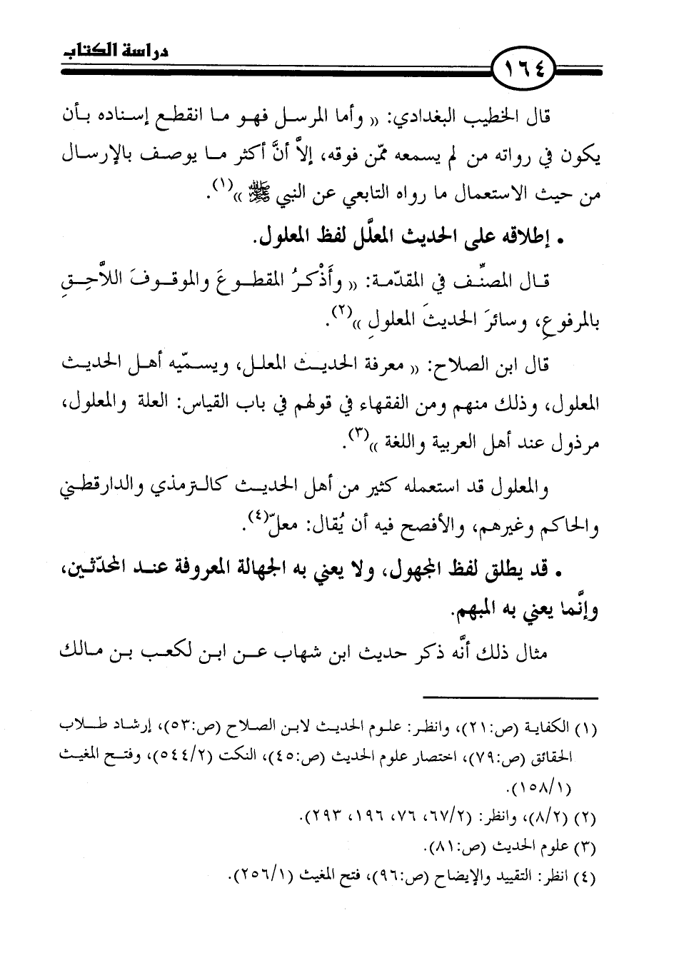 قال ابن الصلاح: "معرفة الحديث المعلل، ويسمّيه أهل الحديث العلول، وذلك منهم ومن الفقهاء في قولهم في باب القياس: العلة والعلول، مرذول عند أهل العربية واللغة" (٣).