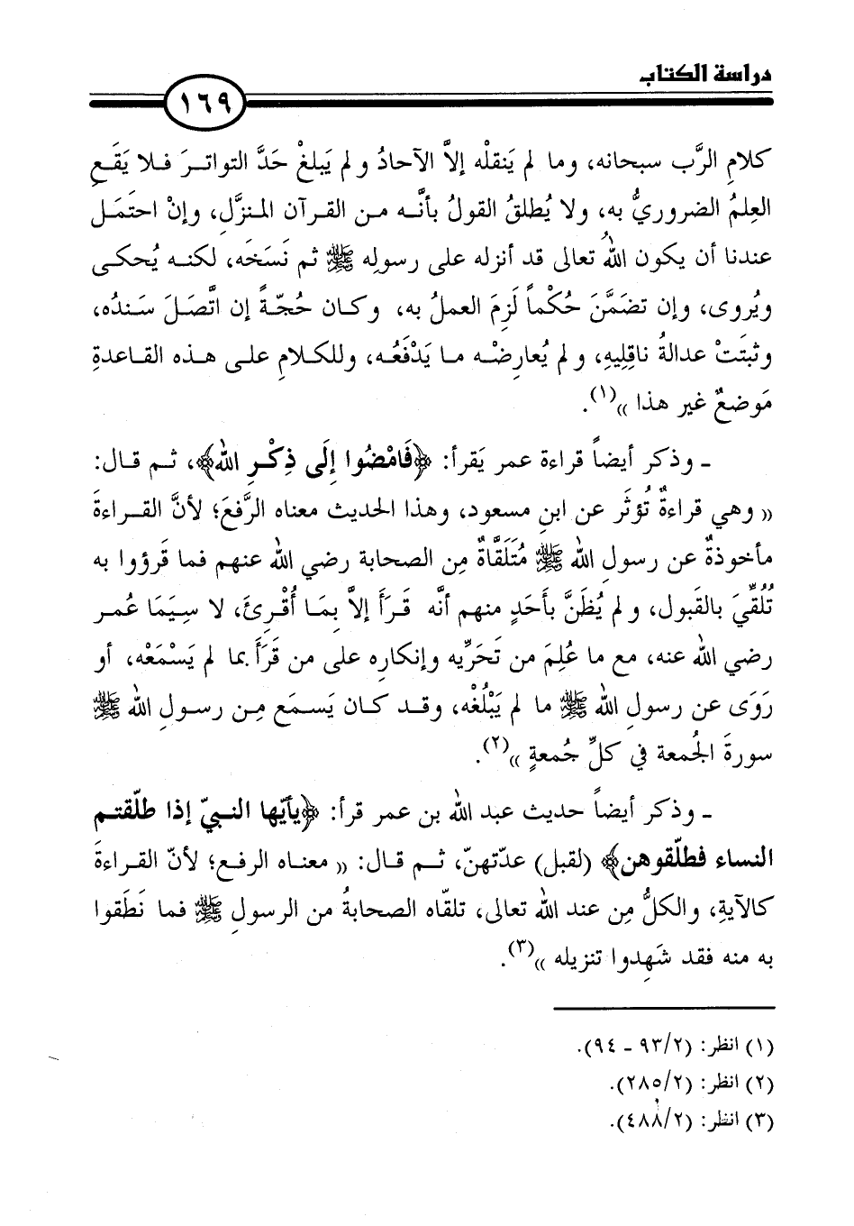 - وذكر أيضًا قراءة عمر يَقرأ: {فَامْضُوا إِلَى ذِكْرِ الله}، ثم قال: "وهي قراءةٌ تُؤثَر عن ابنِ مسعود، وهذا الحديث معناه الرَّفعَ؛ لأنَّ القراءةَ مأخوذةٌ عن رسولِ الله - صلى الله عليه وسلم - مُتَلَقَّاةٌ مِن الصحابة رضي الله عنهم فما قَرؤوا به تُلُقِّيَ بالقَبول، ولم يُظَنَّ بأَحَدٍ منهم أنَّه قَرَأَ إلَّا بِمَا أُقْرِئَ، لا سِيَمَا عُمر رضي الله عنه، مع ما عُلِمَ من تَحَرِّيه وإنكارِه على من قَرَأَ بما لم يَسْمَعْه، أو رَوَى عن رسولِ الله - صلى الله عليه وسلم - ما لم يَبْلُغْه، وقد كان يَسمَع مِن رسولِ الله - صلى الله عليه وسلم - سورةَ الجُمعة في كلِّ جُمعةٍ" (٢).