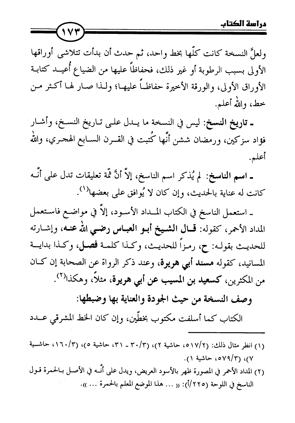 - استعمل الناسخ في الكتاب المداد الأسود، إلَّا في مواضع فاستعمل المداد الأحمر، كقوله: قال الشيخ أبو العباس رضي الله عنه، وإشارته للحديث بقوله: ح، رمزًا للحديث، وكذا كلمة فصل، وكذا بداية المسانيد، كقوله مسند أبي هريرة، وعند ذكر الرواة عن الصحابة إن كان من المكثرين، كسعيد بن المسيب عن أبي هريرة، مثلًا، وهكذا (٢).