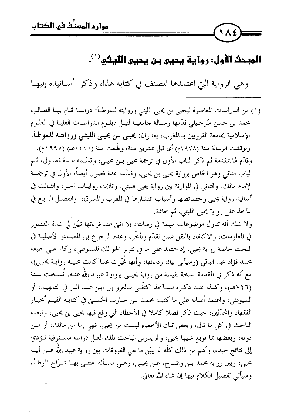 ولا شك أنَّه تناول موضوعات مهمة في رسالته، إلا أنني عند قراءتها تبيّن لي شدة القصور في المعلومات، والاكتفاء بالنقل عمّن تقدّم وتأخّر، وعدم الرجوع إلى المصادر الأصلية في البحث خاصة رواية يحيى، إذ اعتمد على ما في تنوير الحوالك للسيوطي، وكذا على طبعة محمد فؤاد عبد الباقي (وسيأتي بيان رداءتها، وأنها غُيّرت عما كانت عليه رواية يحيى)، مع أنَّه ذكر في المقدمة نسخة نفيسة من رواية يحيى برواية عبيد الله عنه، نسخت سنة (٧٢٦ هـ)، وكذا عند ذكره للمآخذ اكتفى بالعزو إلى ابن عبد البر في التمهيد، أو السيوطي، واعتمد أصالة على ما كتبه محمد بن حارث الخشني في كتابه القيم أخبار الفقهاء والمحدّثين، حيث ذكر فصلا كاملا في الأخطاء التي وقع فيها يحيى بن يحيى، وتبعه الباحث في كل ما قال، وبعض تلك الأخطاء ليست من يحيى، فهي إما من مالك، أو من دونه، وبعضها مما توبع عليها يحيى، ولم يدرس الباحث تلك العلل دراسة مستوفية تؤدي إلى نتائج جيدة، وأهم من ذلك كلّه لم يبيّن ما هي الفروقات بين رواية عبيد الله عن أبيه يحيى، وبين رواية محمد بن وضاح، عن يحيى، وهي مسألة اعتنى بها شرّاح الموطأ، وسيأتي تفصيل الكلام فيها إن شاء الله تعالى.