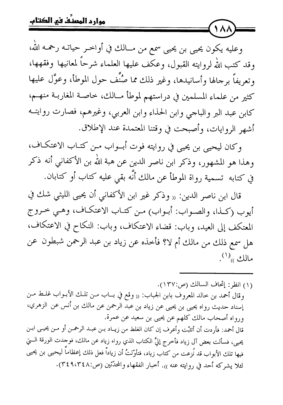 وكان ليحيى بن يحيى في روايته فوت أبواب من كتاب الاعتكاف، وهذا هو الشهور، وذكر ابن ناصر الدين عن هبة الله بن الأكفاني أنه ذكر في كتابه تسمية رواة الموطأ عن مالك أنَّه بقي عليه كتاب أو كتابان.