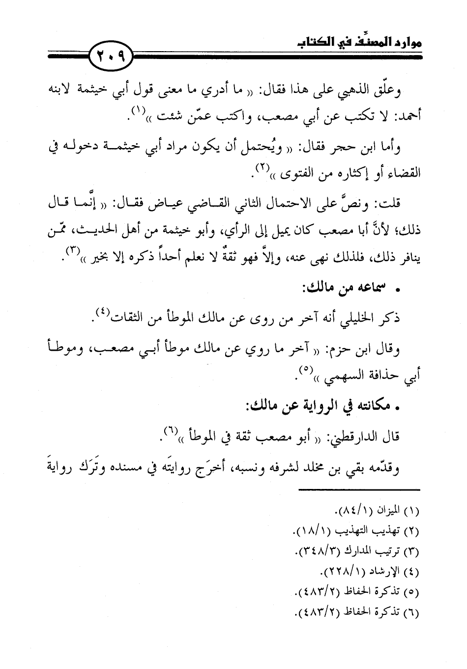 قلت: ونصَّ على الاحتمال الثاني القاضي عياض فقال: "إنَّما قال ذلك؛ لأنَّ أبا مصعب كان يميل إلي الرأي، وأبو خيثمة من أهل الحديث، ممّن ينافر ذلك، فلذلك نهي عنه، وإلَّا فهو ثقةٌ لا نعلم أحدًا ذكره إلا بخير" (٣).