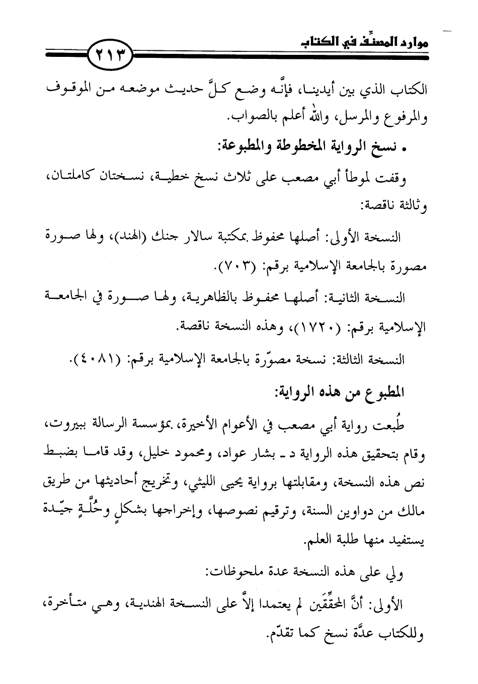 وقفت لموطأ أبي مصعب على ثلاث نسخ خطية، نسختان كاملتان، وثالثة ناقصة: