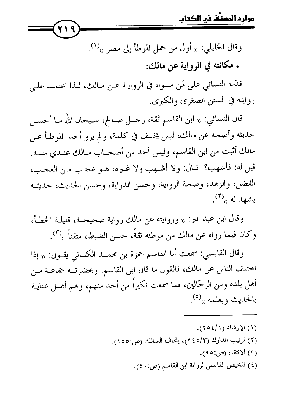 وقال القابسي: سمعت أبا القاسم حمزة بن محمد الكناني يقول: "إذا اختلف الناس عن مالك، فالقول ما قال ابن القاسم. وبحضرته جماعة من أهل بلده ومن الرحّالين، فما سمعت نكيرًا من أحد منهم، وهم أهل عناية بالحديث وبعلمه" (٤).