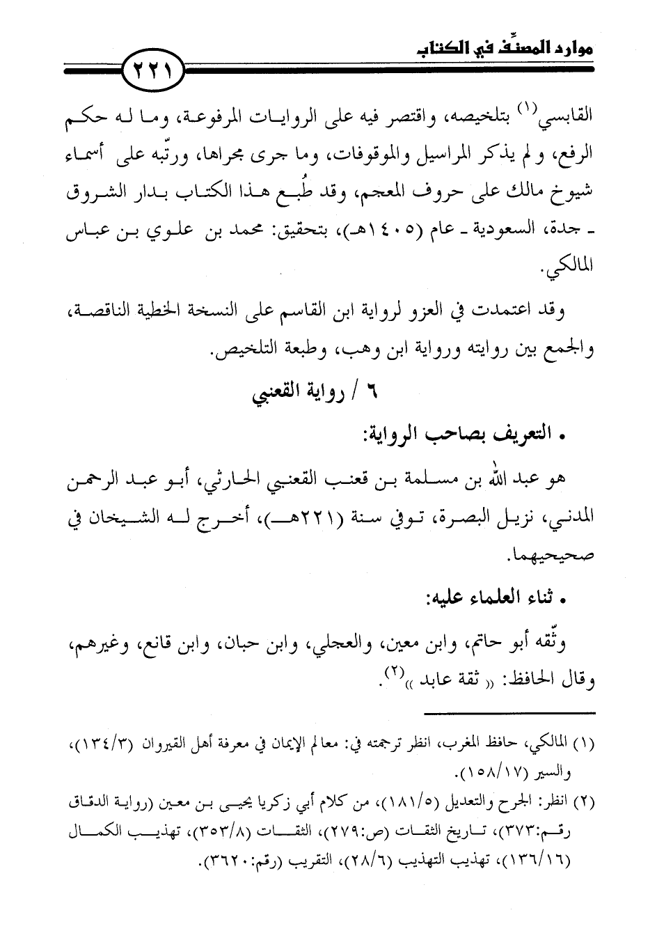 القابسي (١) بتلخيصه، واقتصر فيه علي الروايات المرفوعة، وما له حكم الرفع، ولم يذكر المراسيل والموقوفات، وما جري مجراها، ورتّبه علي أسماء شيوخ مالك علي حروف المعجم، وقد طُبع هذا الكتاب بدار الشروق -جدة، السعودية- عام (١٤٠٥ هـ)، بتحقيق: محمد بن علوي بن عباس المالكي.