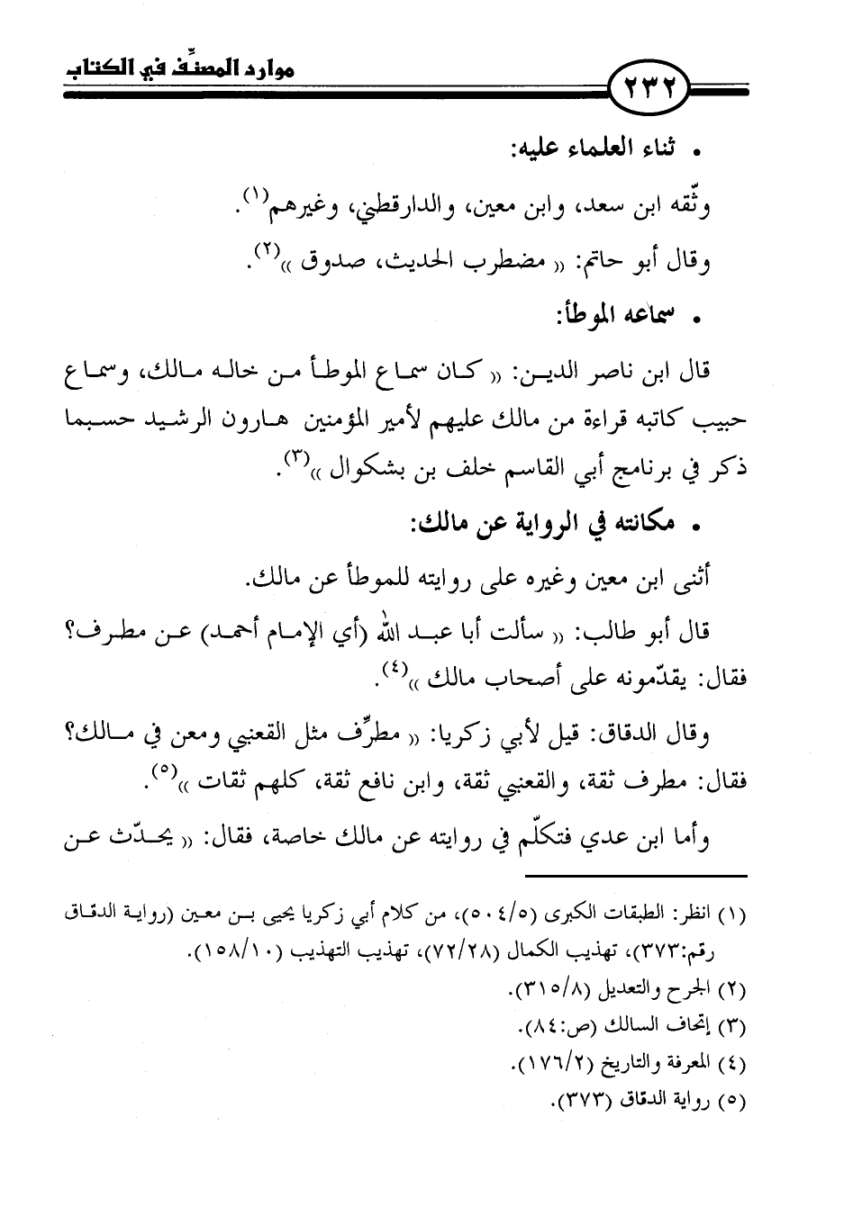 وقال الدقاق: قيل لأبي زكريا: "مطرِّف مثل القعنبي ومعن في مالك؟ فقال: مطرف ثقة، والقعنبي ثقة، وابن نافع ثقة، كلهم ثقات" (٥).