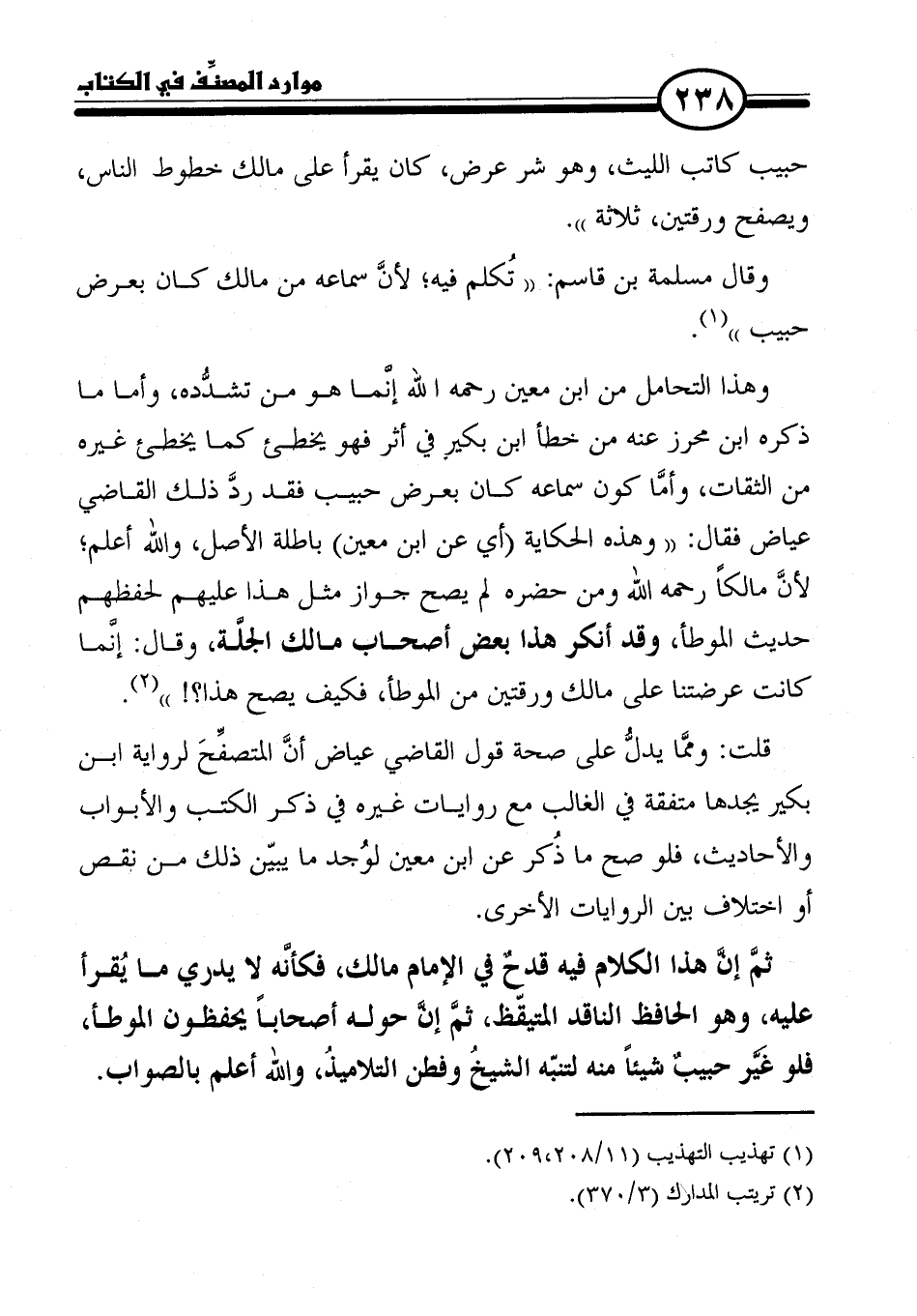 ثمَّ إنَّ هذا الكلام فيه قدحٌ في الإمام مالك، فكأنَّه لا يدري ما يُقرأ عليه، وهو الحافظ الناقد المتيقّظ، ثمَّ إنَّ حوله أصحابًا يحفظون الموطأ، فلو غَيّر حبيبٌ شيئًا منه لتنبّه الشيخُ وفطن التلاميذُ، والله أعلم بالصواب.