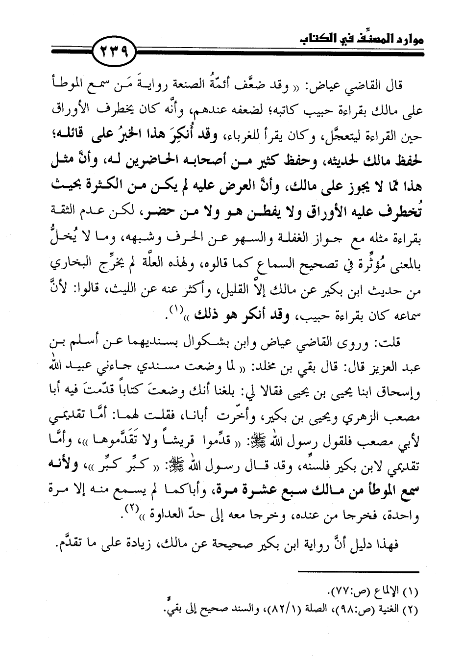 قلت: وروى القاضي عياض وابن بشكوال بسنديهما عن أسلم بن عبد العزيز قال: قال بقي بن مخلد: "لما وضعت مسندي جاءني عبيد الله وإسحاق ابنا يحيى بن يحيى فقالا لي: بلغنا أنك وضعتَ كتابًا قدّمتَ فيه أبا مصعب الزهري ويحيي بن بكير، وأخّرت أبانا، فقلت لهما: أمَّا تقديمي لأبي مصعب فلقول رسول الله - صلي الله عليه وسلم -: "قدِّموا قريشًا ولا تَقَدَّموها"، وأمَّا تقديمي لابن بكير فلسنِّه، وقد قال رسول الله - صلي الله عليه وسلم -: "كبِّر كبِّر"، ولأنه سمع الموطأ من مالك سبع عشرة مرة، وأباكما لم يسمع منه إلا مرة واحدة، فخرجا من عنده، وخرجا معه إلي حدّ العداوة" (٢).