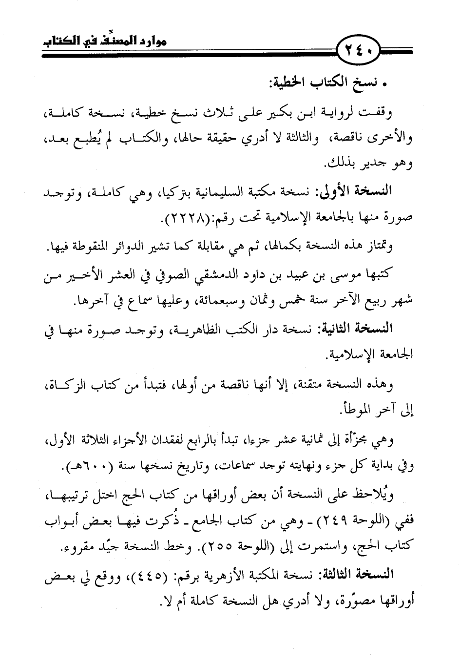 ويُلاحظ علي النسخة أن بعض أوراقها من كتاب الحج اختل ترتيبها، ففي (اللوحة ٢٤٩) -وهي من كتاب الجامع- ذُكرت فيها بعض أبواب كتاب الحج، واستمرت إلي (اللوحة ٢٥٥). وخط النسخة جيّد مقروء.